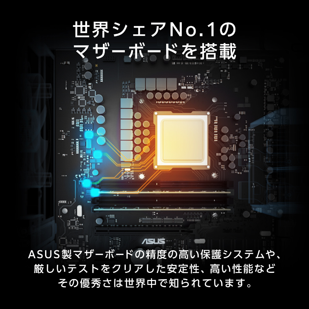 ASUSは、世界シェアNo.1※のマザーボードブランドです。ASUS製マザーボードの、ハードウェアをしっかりと守る保護システムや、広範囲に渡る厳しいテストで実現した24時間365日の使用に耐えられる安定性、どんな時も期待を裏切らない高い性能など、その優秀さは世界中で知られています。※2025年、ASUS自社調べ。