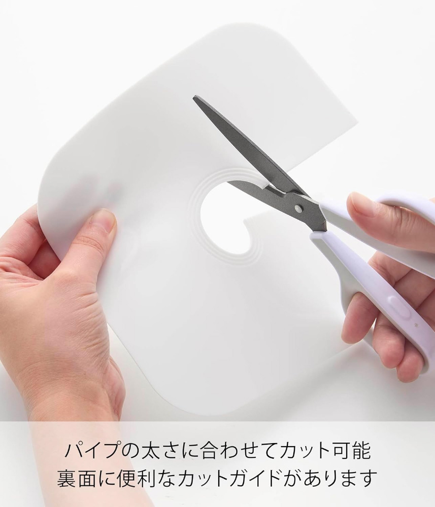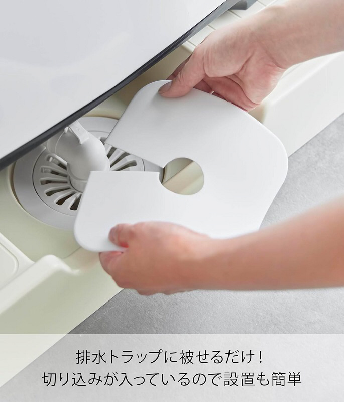 洗濯機の排水トラップのホコリや髪の毛などの汚れを防ぐカバーです。裏面にはカットしやすいカットガイドがあるので排水ホースの太さに合わせて簡単にカットできます。キッチンや洗面台のシンク下の排水管周りにできた隙間からの虫の侵入防止カバーとしても使えます。切り込みが入っているので排水トラップに簡単に被せることができ、お掃除しやすくお手入れが簡単です。