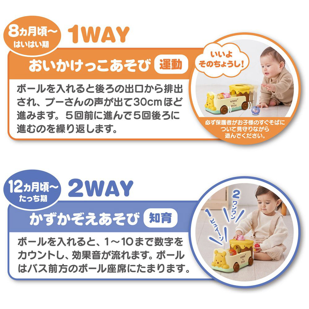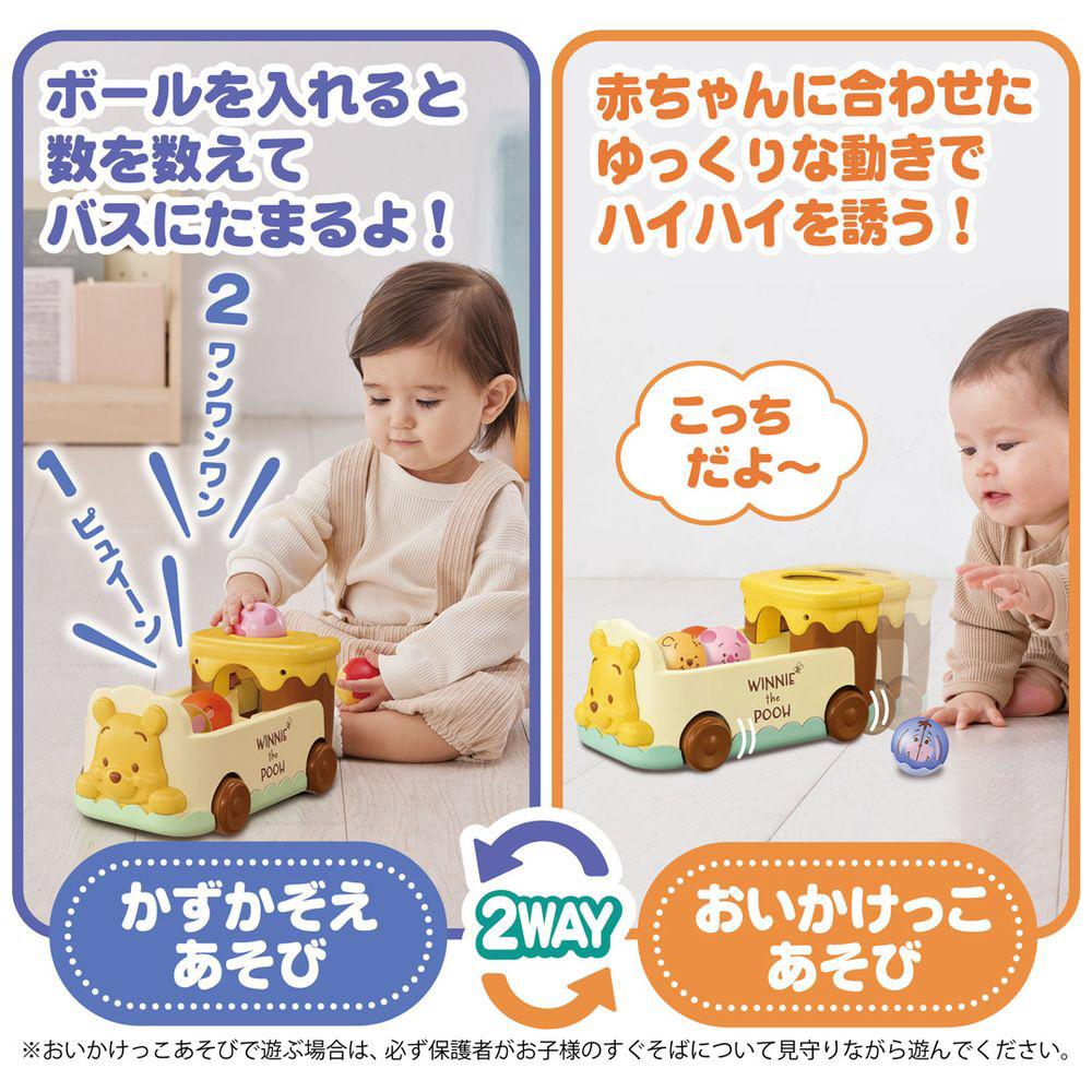 おいかけっこ遊びと数かぞえ遊びが楽しめる、2WAY仕様のくまのプーさんのボールバスです。