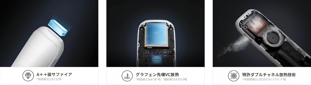 サファイア冷感技術により、30分間の連続使用において、表面温度を20度以下に保つことで、肌を冷やして照射時の熱さや痛みを和らげる機能を搭載しています。