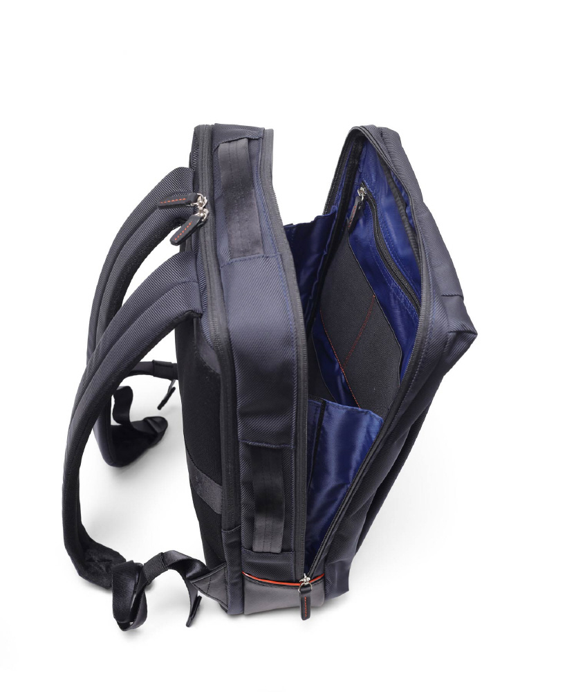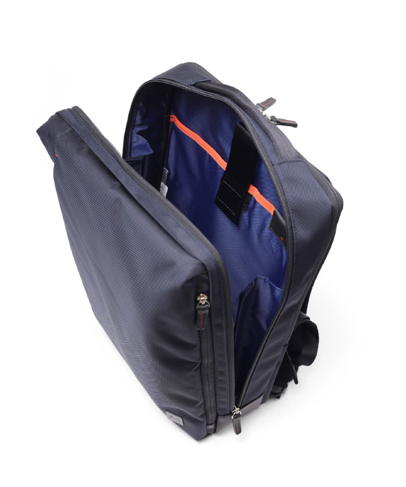 本体構造は2ルーム+前ポケット仕様で、背面ルームはクッション材入りのPC対応です。13〜14インチのパソコンが収納できます。メインルームには、ガジェット付属品などの小物も収納しやすいゴムポケットを装備。ペットボトルや小物が収納できる前ファスナーポケットなど、分類収納にも優れています。