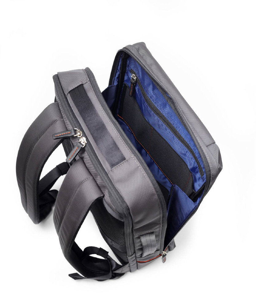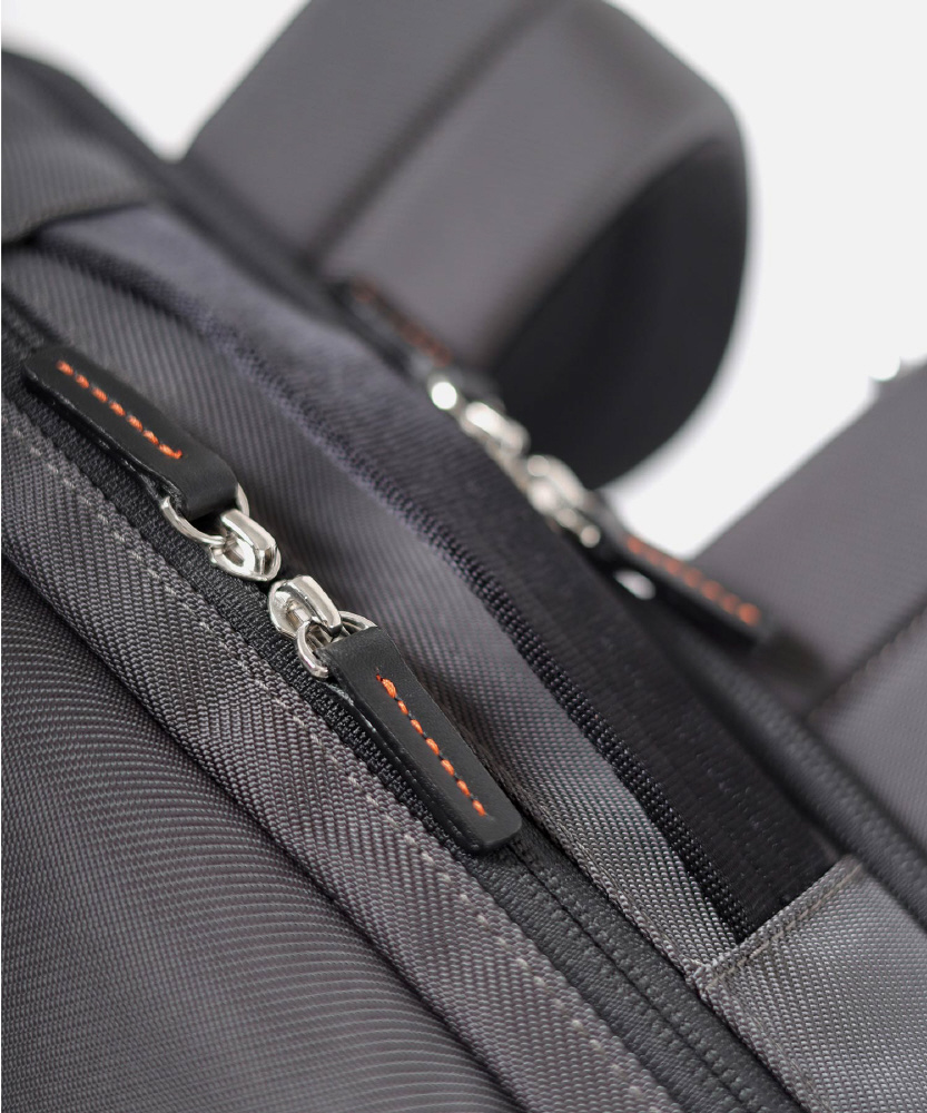 本体構造は2ルーム+前ポケット仕様で、背面ルームはクッション材入りのPC対応です。13〜14インチのパソコンが収納できます。メインルームには、ガジェット付属品などの小物も収納しやすいゴムポケットを装備。ペットボトルや小物が収納できる前ファスナーポケットなど、分類収納にも優れています。