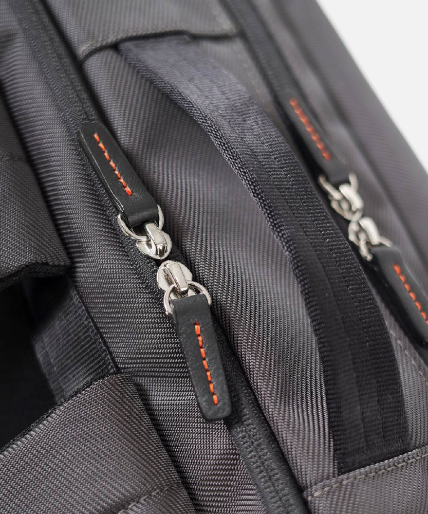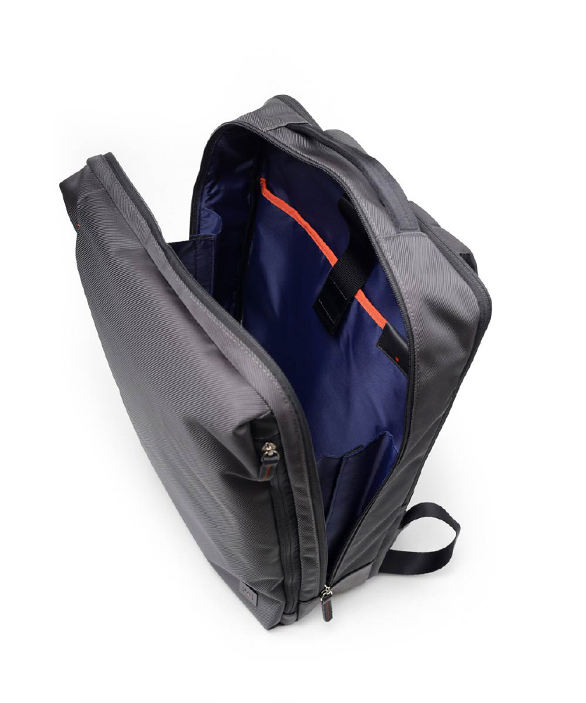 本体構造は2ルーム+前ポケット仕様で、背面ルームはクッション材入りのPC対応です。15.6インチのパソコンが収納できます。メインルームには、ガジェット付属品などの小物も収納しやすいゴムポケットを装備。ペットボトルや小物が収納できる前ファスナーポケットなど、分類収納にも優れています。