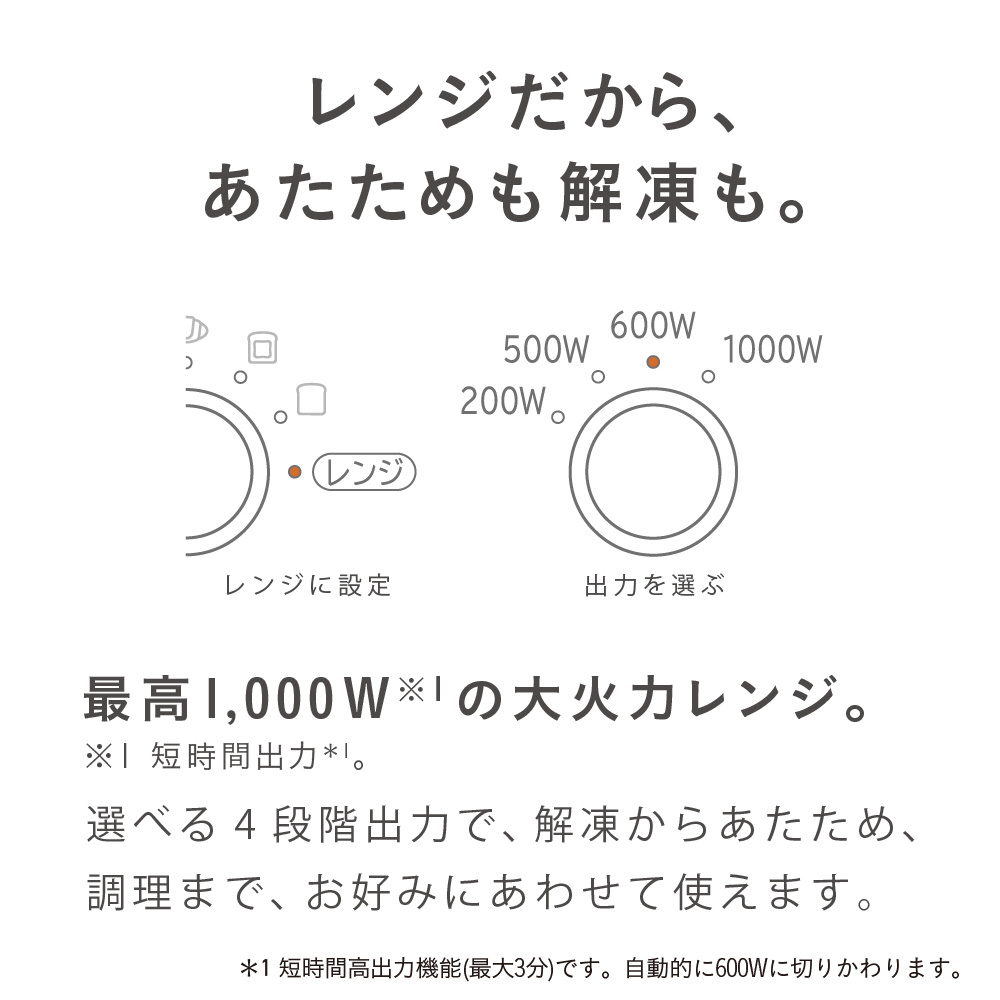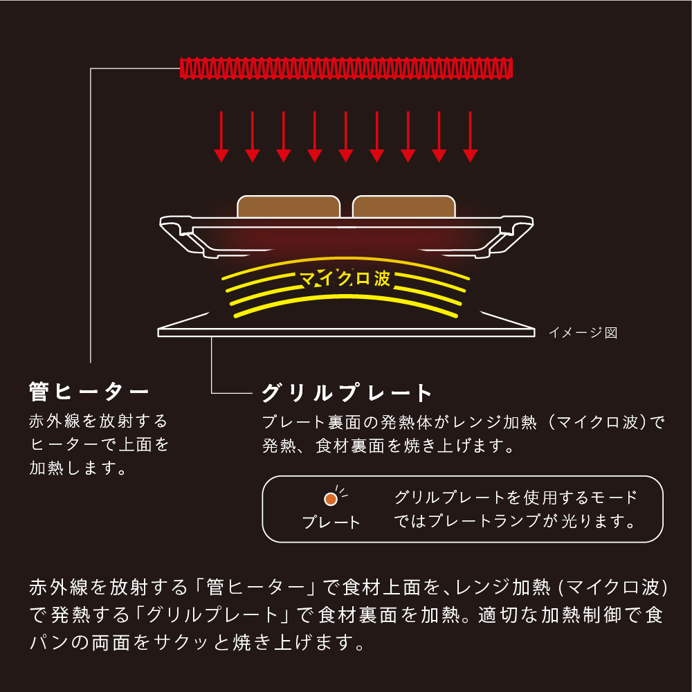 トーストをこんがりサクッと焼き上げ、こんがり焼き目のグリル料理もでき、レンジ加熱であたためや解凍もできます。