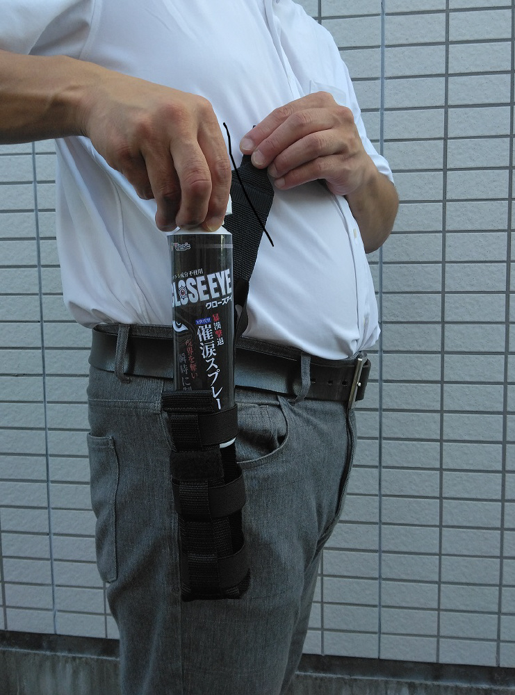 催涙効果を保ち環境負荷を抑えた、屋内で使える催涙スプレー。500mlペットボトルも入れられるホルダー付きセット。