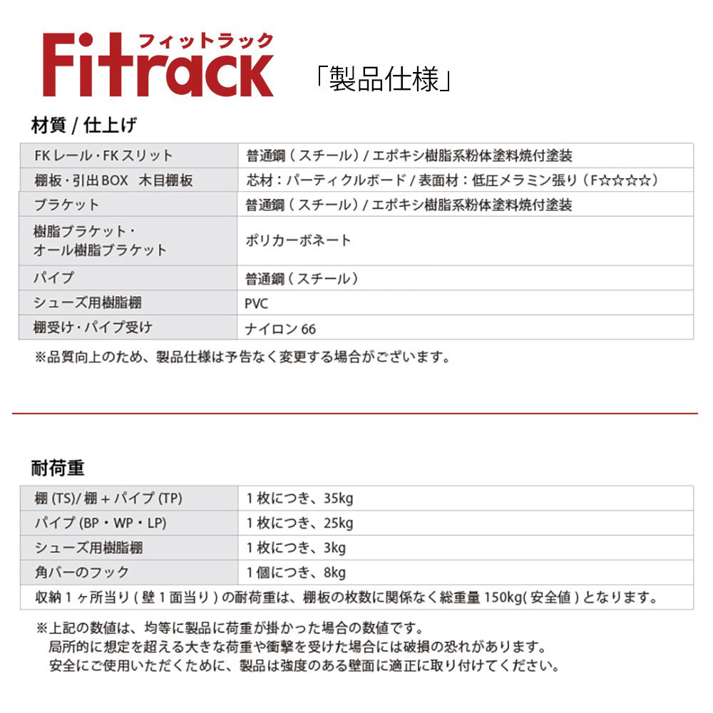 ※耐荷重1面150kgは下地に取付た場合の耐荷重となります。壁一面の耐荷重は棚板の枚数に関係なく、総重量150kgとなります。