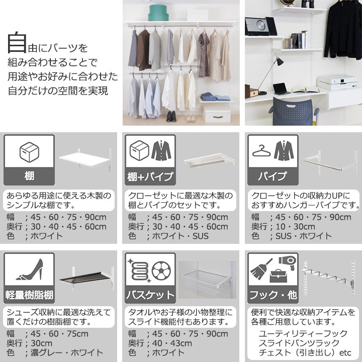 多様なライフスタイルにも対応する豊富なオプションパーツをご用意。基本的な棚板はもちろんシューズ用の棚板、バスケット、引き出し、ハンガー等々、ライフスタイルに合わせて細かいニーズに応えるラインナップです。レール・スリットはホワイトとプラック、棚板はホワイトと木目があり、可能な組み合わせは3通り。クローゼットはホワイトですっきり、リビングはプラックと木目でカッコ良くなど場所ごとに雰匿気を変えることができます。人によって三者三様、一人ひとりの収納の形に合わせて楽しみながら自分だけの収納づくりができます。
