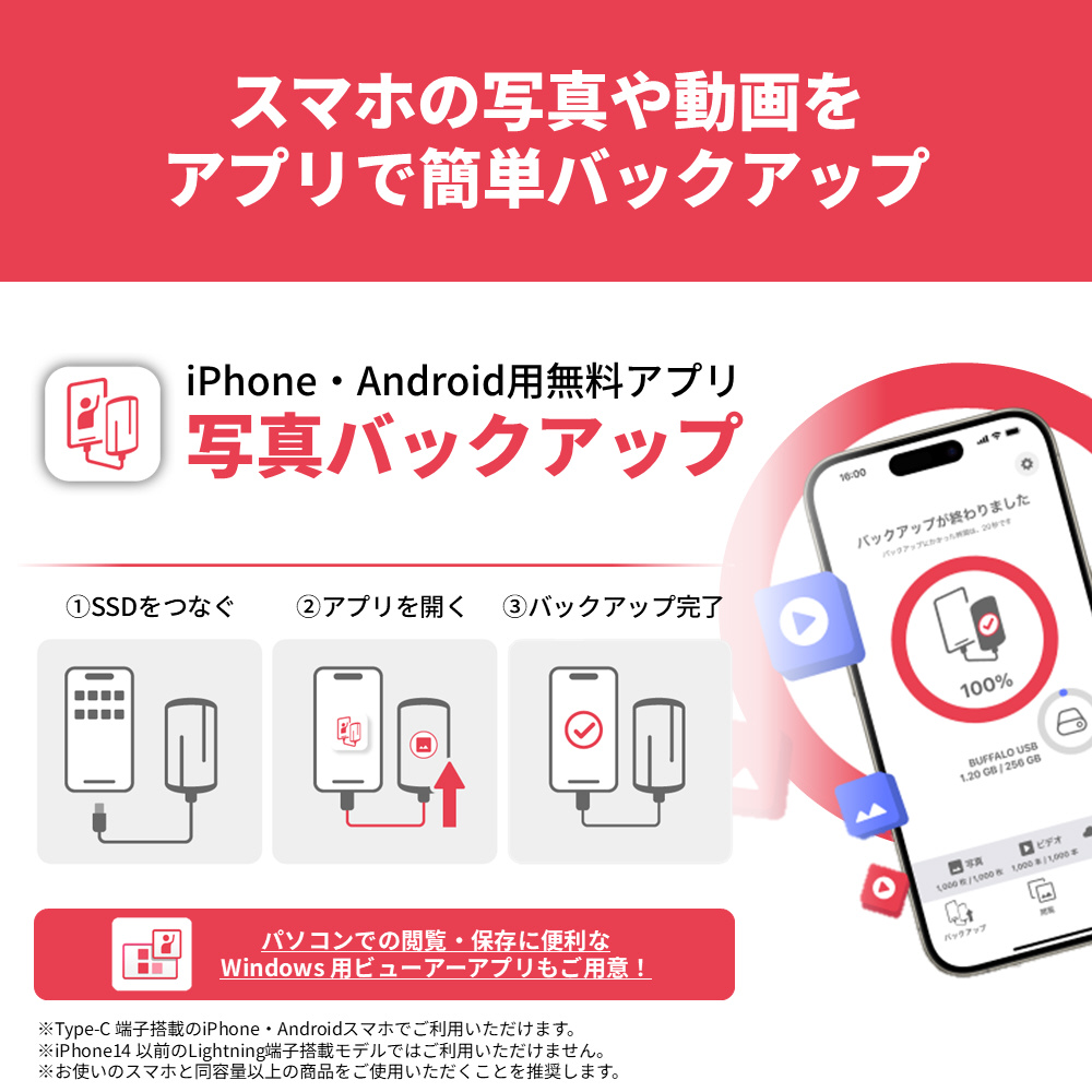 本商品は、バッファローアプリ「写真バックアップ」(無料)に対応。大切な思い出をもっと簡単に保存できます。
