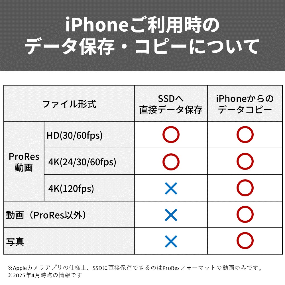 ※iPhoneカメラアプリでSSDの空き容量が無くなるまでProRes撮影を行う場合、アプリ側の処理の問題により最後の部分でフレームレートが低下します。SSDの空き容量が無くなるまでの撮影はしないことを推奨します。