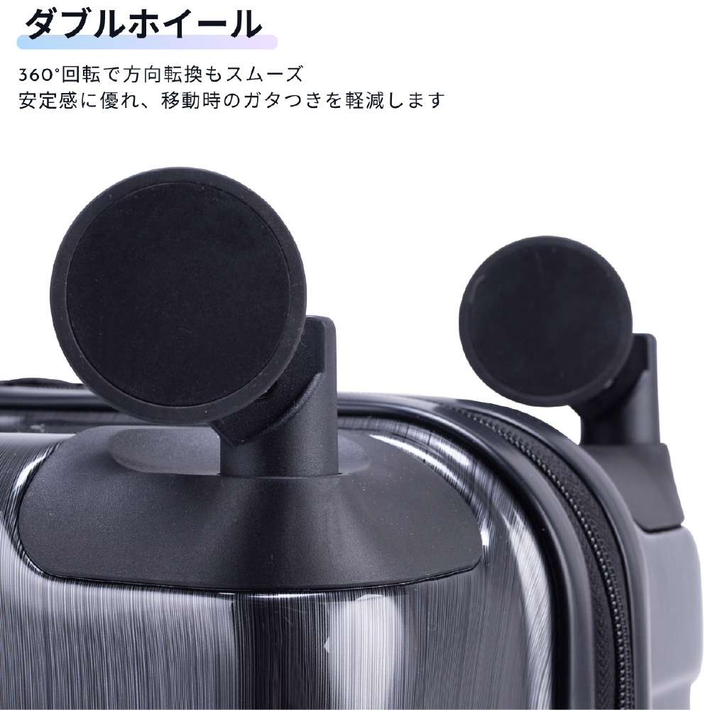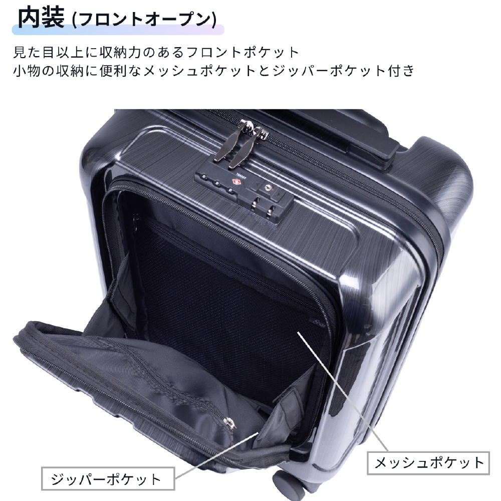 移動中にサッと荷物を取り出せる、フロントオープン仕様のスーツケース。コンパクトなサイズ感ながら、必要な荷物をしっかり収納できる工夫が詰まったモデルです。出張や短期旅行、普段使いとしてもおすすめです。