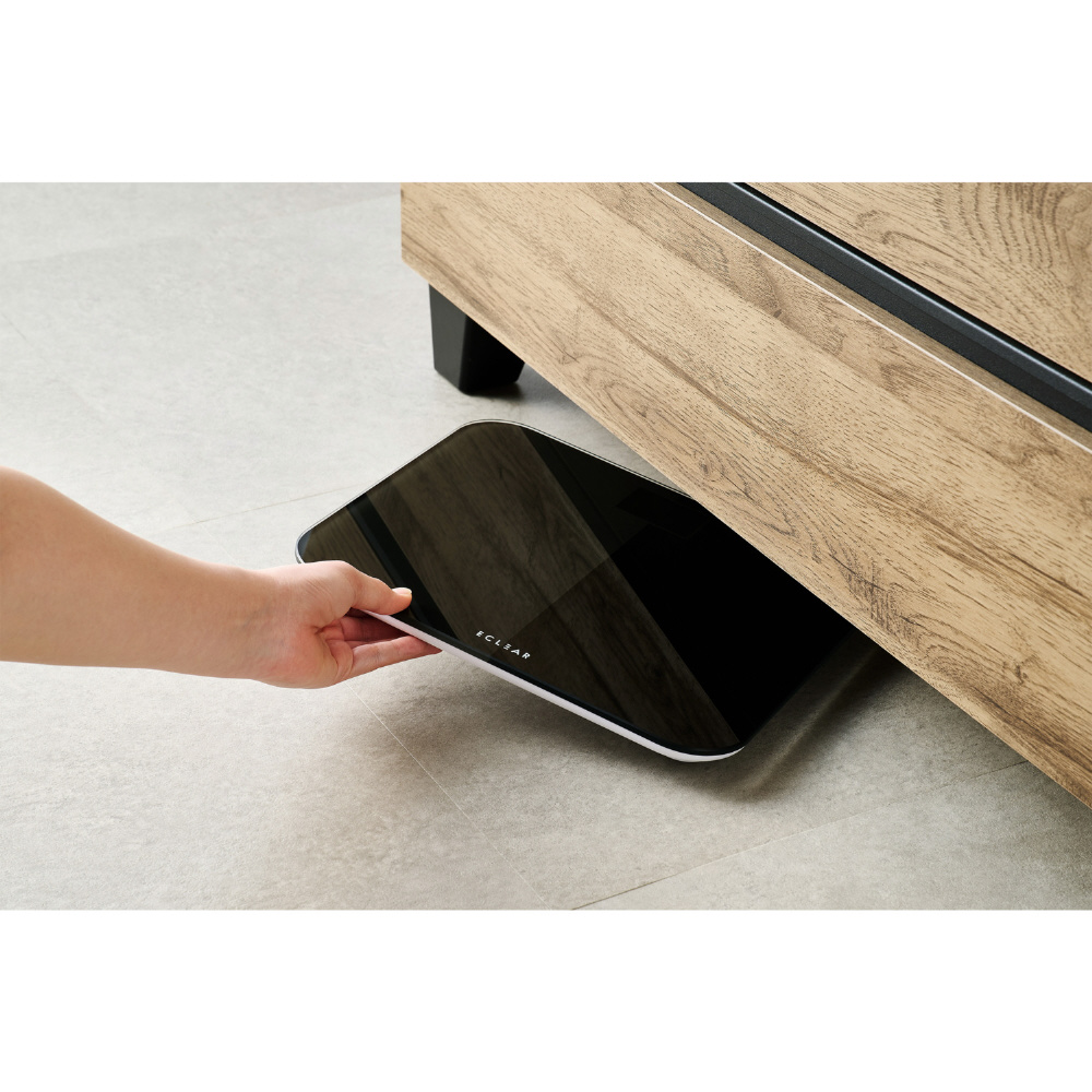 毎日の使いやすさにこだわったデザイン。 見やすい液晶画面で、場所をとらないスリム&コンパクト設計のエクリア 体重計。