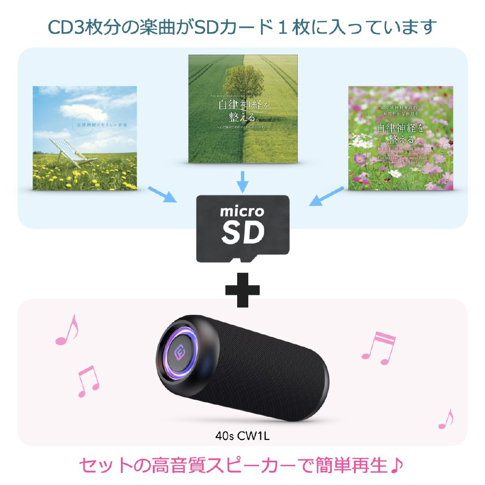 40sの高音質スピーカーとDellaのBGM音源のコラボ商品。心身をリラックスさせる楽曲入SDカード同梱。