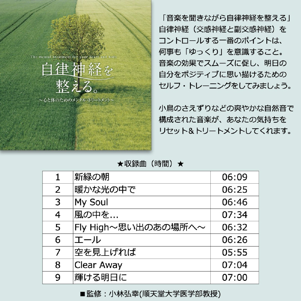 ※曲順 01-07はアルバム「自律神経にやさしい音楽」、曲順08-16はアルバム「自律神経を整える。〜心と体のためのメンタル・トリートメント」、曲順17-24はアルバム「自律神経を整える〜やすらぎの時間へと誘う音楽」に、それぞれ収録されている曲となります。