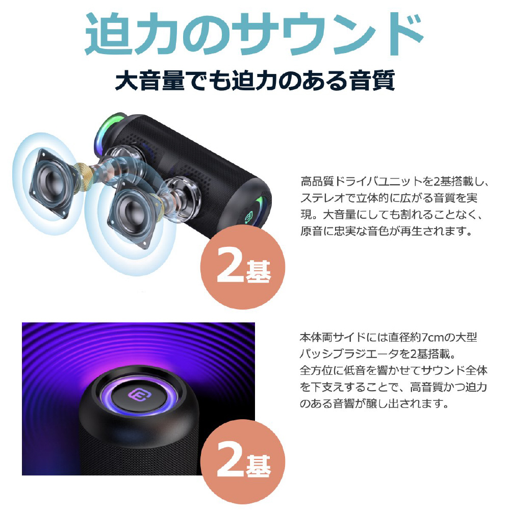 合計15Wのステレオスピーカーに加え、重低音を響かせる2つのパッシブラジエーターを搭載。高音から低音まで、大音量でも割れることなく小音量でもバランスが崩れません。