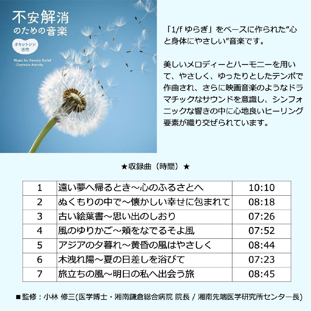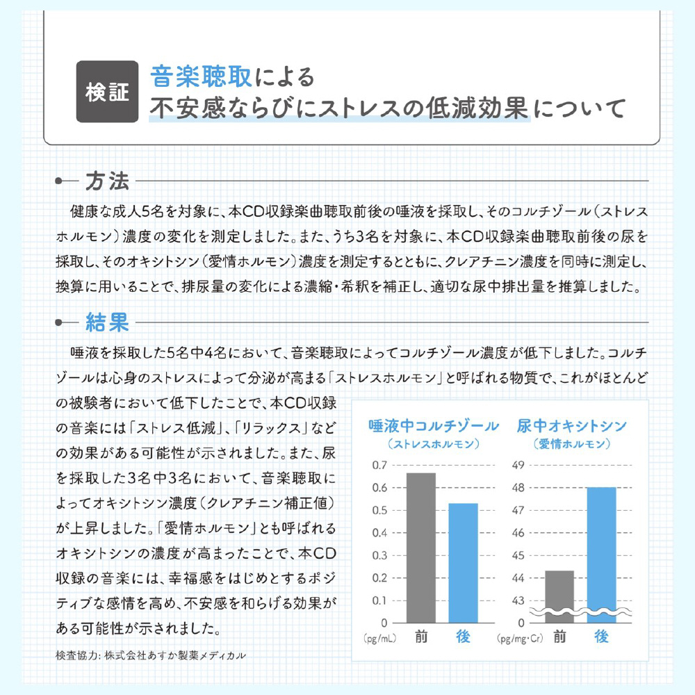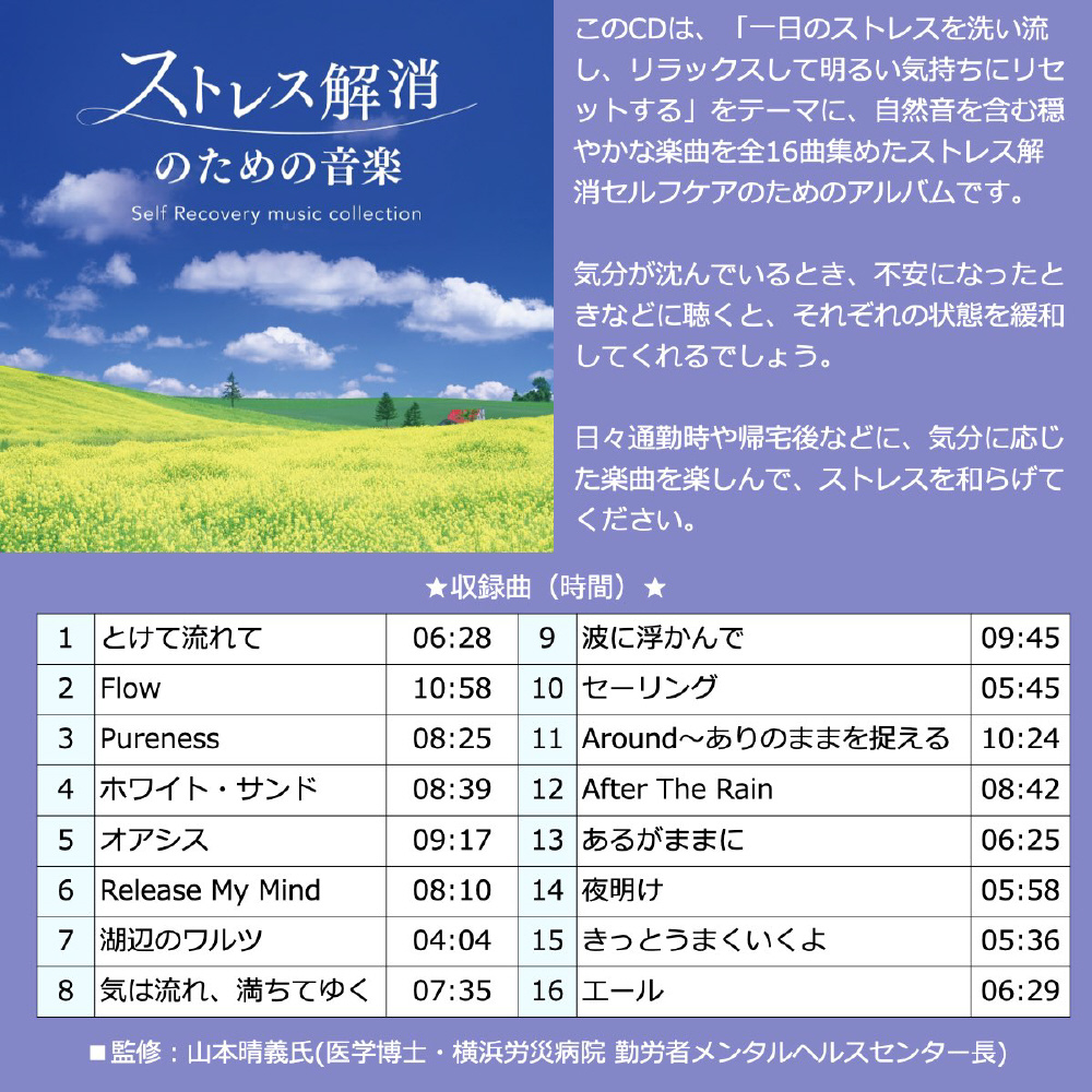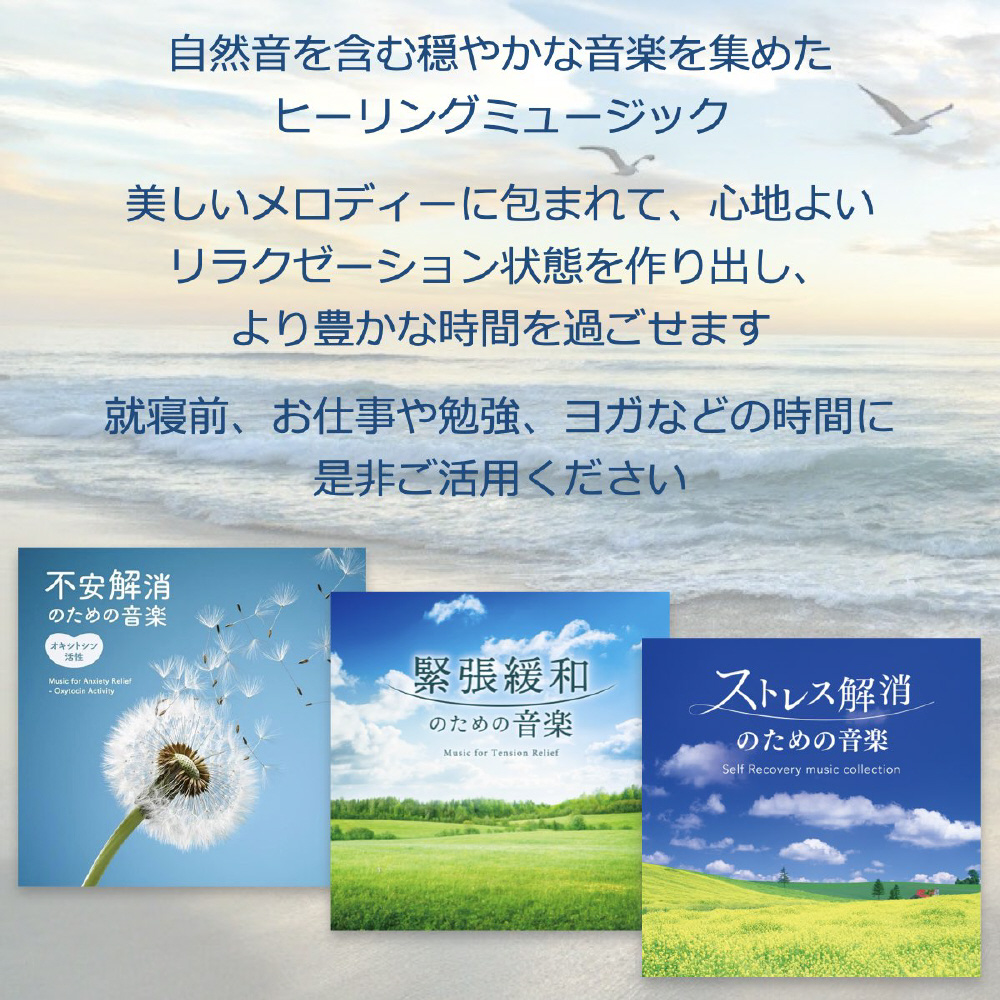 ※曲順 01-07はアルバム「不安解消のための音楽〜オキシトシン活性」、曲順08-14はアルバム「緊張緩和のための音楽 」、曲順15-30はアルバム「ストレス解消のための音楽〜セルフ・リカバリー・ミュージック・コレクション」に、それぞれ収録されている曲となります。