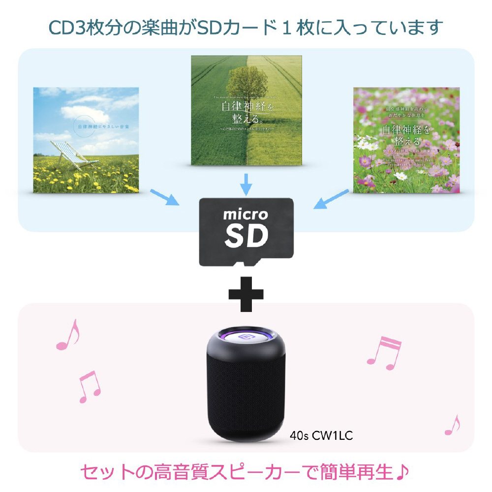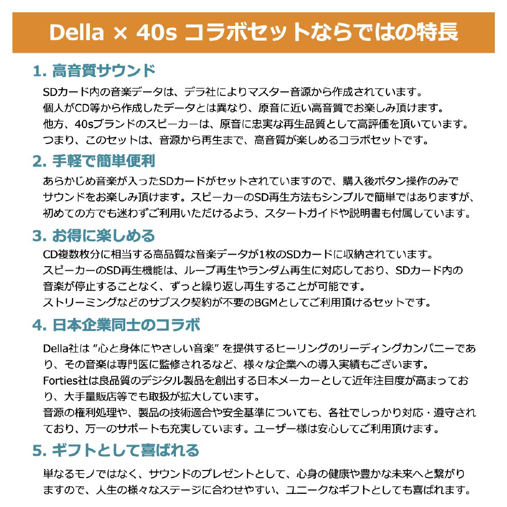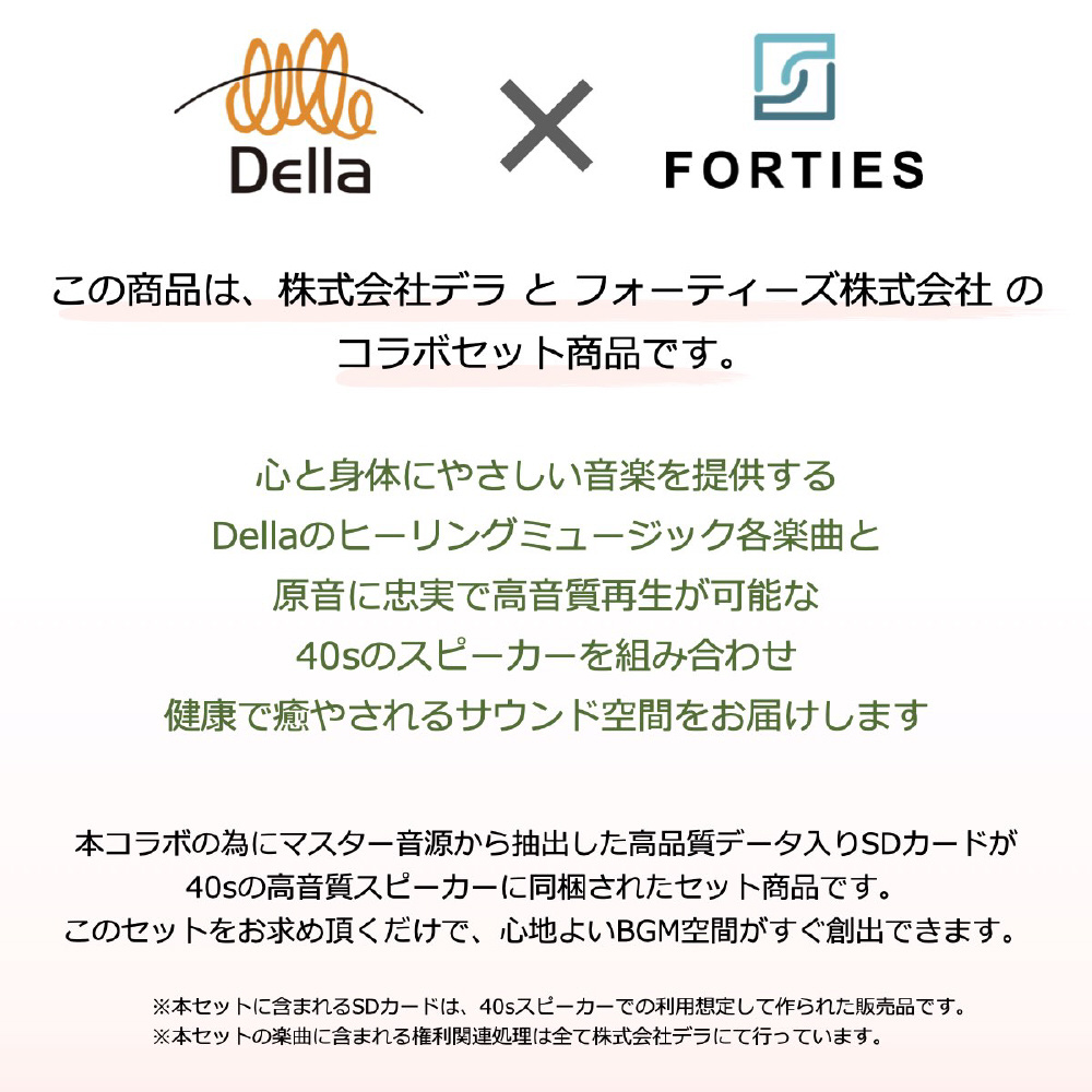 40sのコンパクトスピーカーとDellaのBGM音源のコラボ商品。心身をリラックスさせる楽曲入SDカード同梱。
