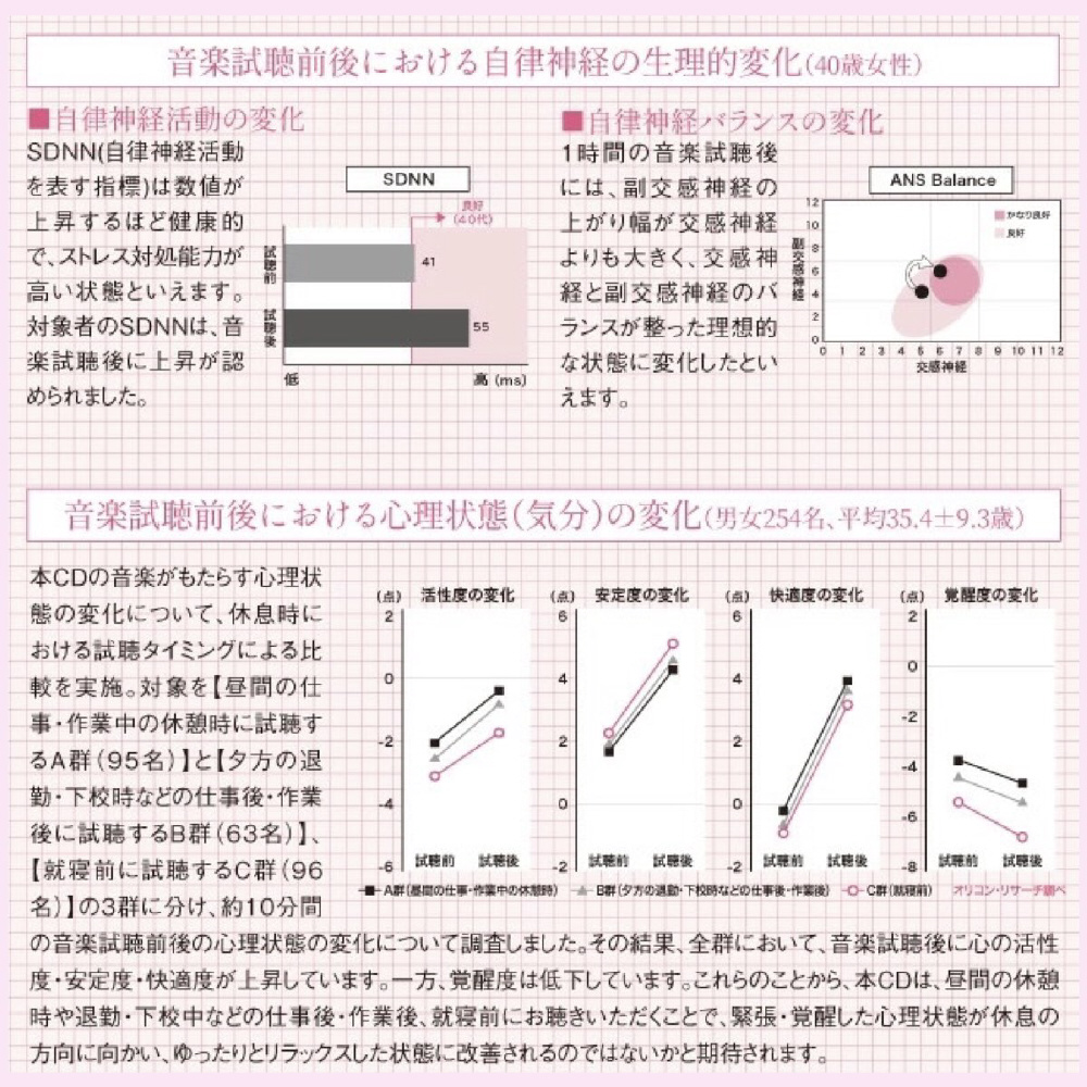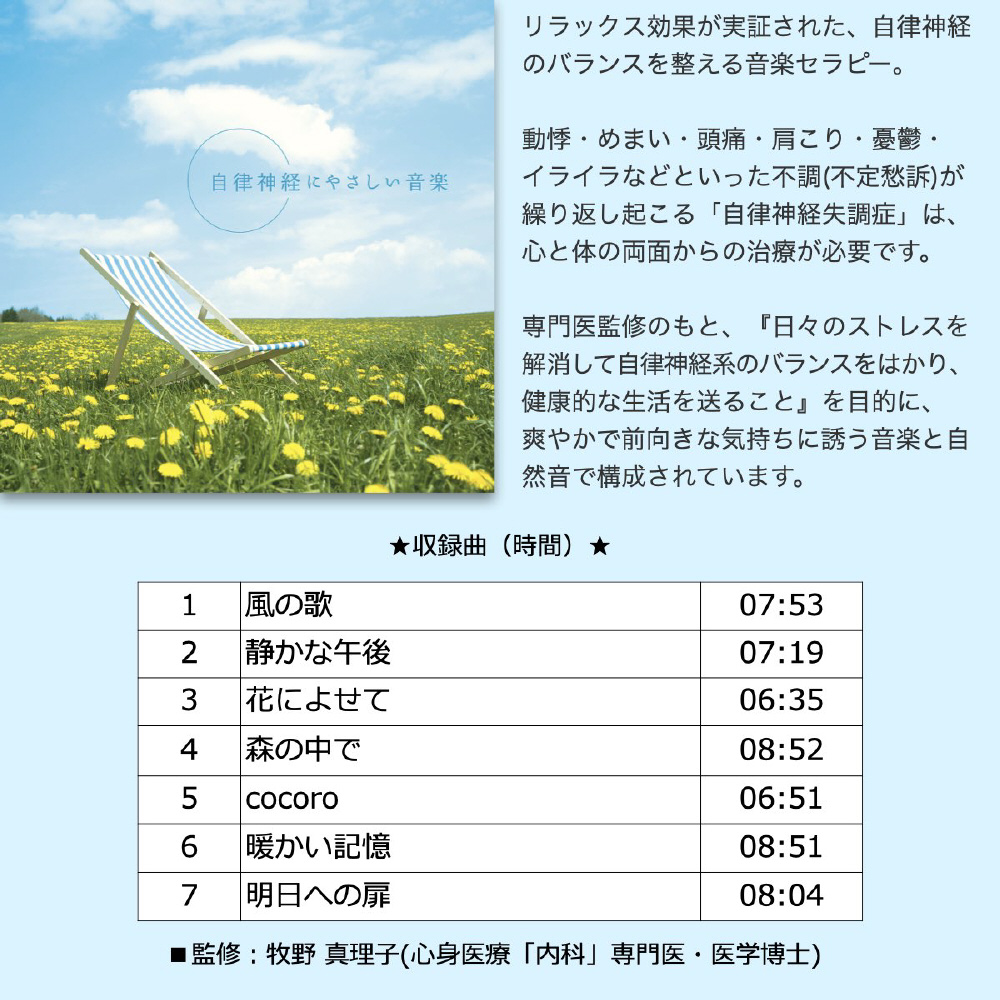※曲順 01-07はアルバム「自律神経にやさしい音楽」、曲順08-16はアルバム「自律神経を整える。〜心と体のためのメンタル・トリートメント」、曲順17-24はアルバム「自律神経を整える〜やすらぎの時間へと誘う音楽」に、それぞれ収録されている曲となります。