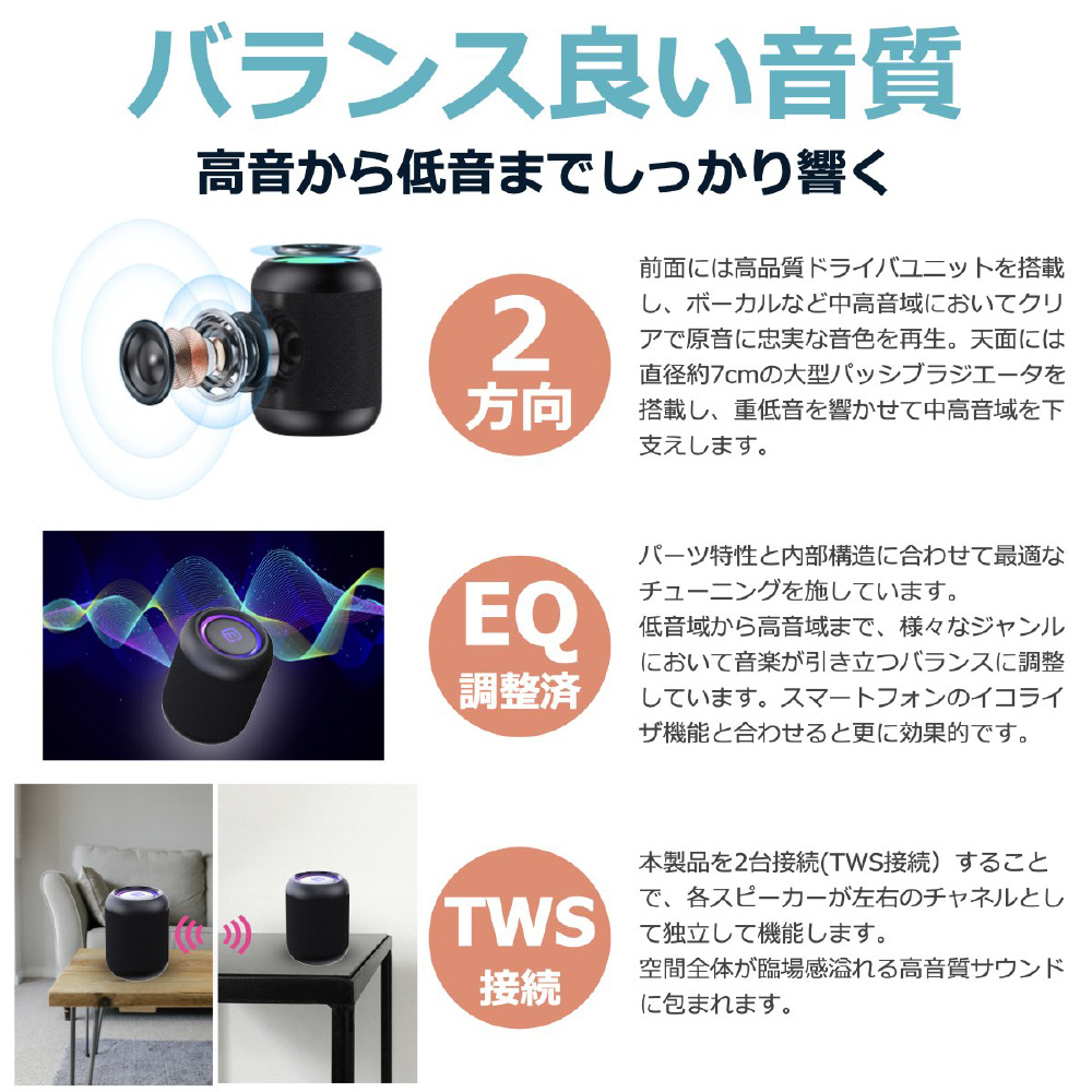 7.5Wの前面スピーカーに加え、重低音を響かせるパッシブラジエーターを上面に搭載。ボリュームの大小を問わず、伸びのあるサウンドがお楽しみ頂けます。