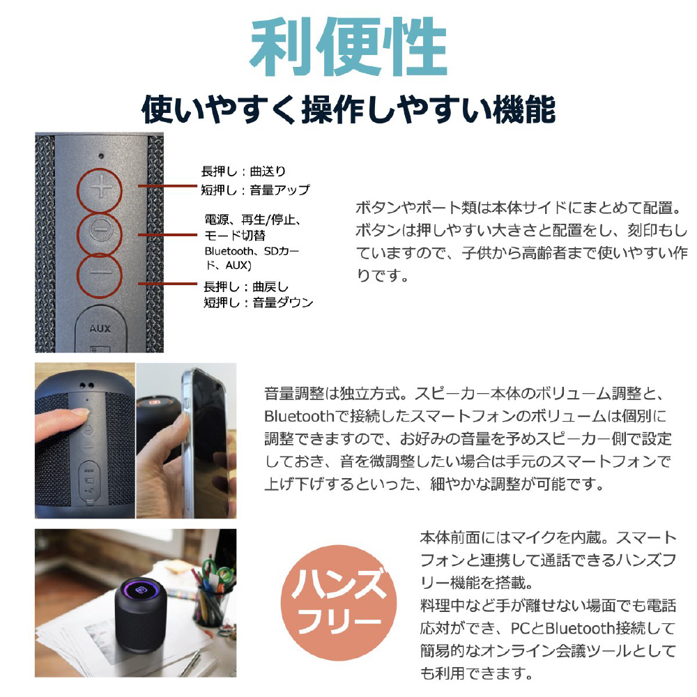 マイク内蔵で、接続中のスマートフォンを通したハンズフリー通話や、PCやMacの手元スピーカー兼マイクとしても利用できます。AUX入力端子で音楽プレイヤーと有線接続も可能です。