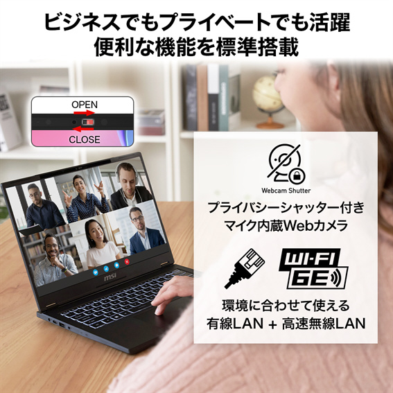 ■ビデオ通話・会議に重宝するマイク内蔵Webカメラ(プライバシーシャッター付き)に加え、高速無線LAN「Wi-Fi 6E」や有線LANなど便利な機能を標準搭載。