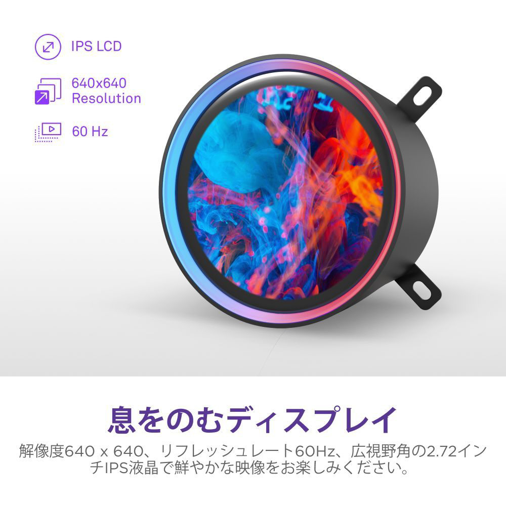 640×640の高解像度ディスプレイでGIFやシステム情報を表示可能。RGB LEDリングや静音ファンにより、冷却性能とビジュアルを両立。