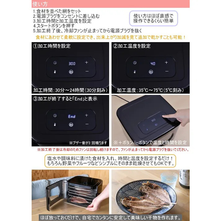 食中毒を防ぐため必ず下記のことを守ってください。1.新鮮な食材を使用する。2.使用する調理器具・網はよく洗浄し、清潔な場所で保管する。3.干物の加工終了後、保存するときは早めに冷蔵/ 冷凍する。4.冷蔵/ 冷凍保存した加工物は、5日を目安に食べきる。蒸気や熱で壁や家具を傷めたり、加工物のにおいが移る原因になりますので、壁や家具から20cm 以上離して設置してください。