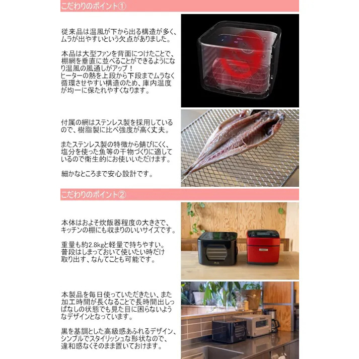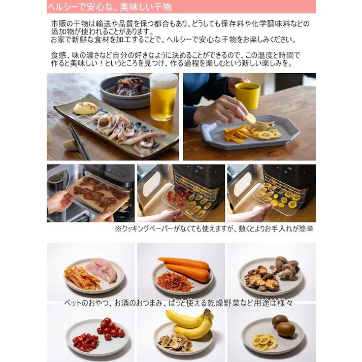 魚やお肉はもちろん、ドライフルーツ作り、ヘルシーなペットのおやつなどオリジナル干物を天候に影響されず好きな時に作れます。