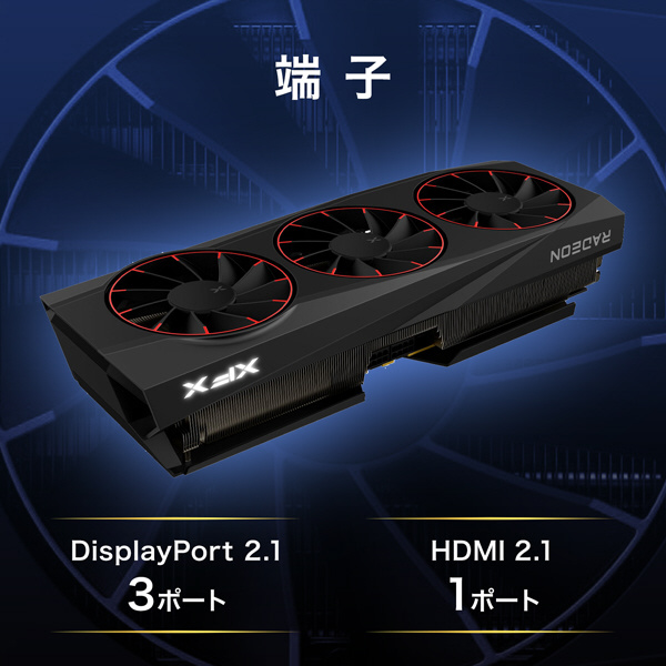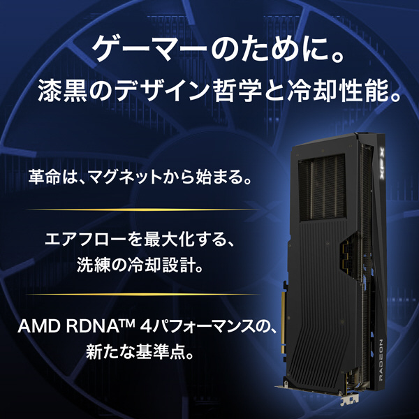 AMD Radeon RX 9070 XT搭載。16GBメモリとトリプルファン搭載。磁気冷却設計でファンを取り外し可能なグラフィックボード。