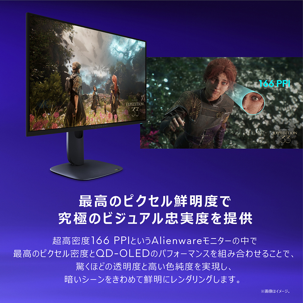超高密度166 PPIというAlienwareモニターの中で最高のピクセル密度とQD-OLEDのパフォーマンスを組み合わせることで、驚くほどの透明度と高い色純度を実現し、暗いシーンをきわめて鮮明にレンダリングします。