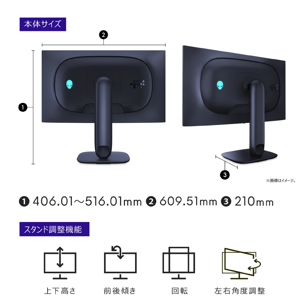 また、設置面積の小さいベースの採用により、スペース効率を向上。スタンド ライザーで、ケーブルを隠してすっきり収納できます。フル機能のAlienware Command Center 6.6をサポート。