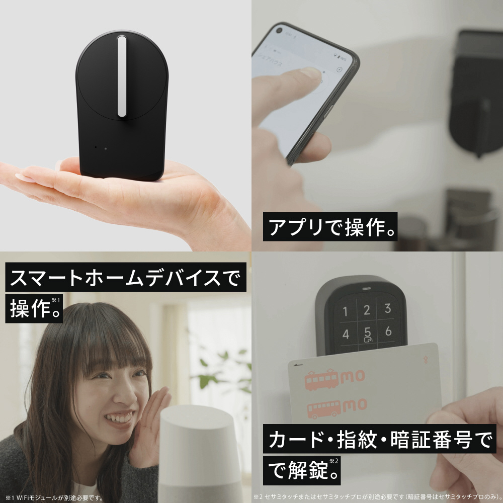 【9種の開錠方法】アプリ、ウィジェット、Apple watch, 物理キーでの開錠が可能。さらにWifiモジュールとの併用で音声操作や遠隔操作が可能に。セサミタッチやセサミタッチプロを併用すれば指紋認証、Suica等のICカード、暗証番号での開錠も可能に。