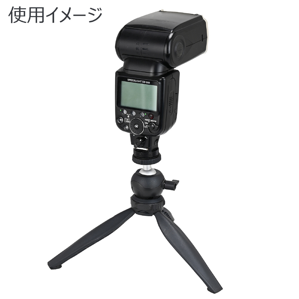 底面に三脚用取付ネジ(1/4インチ)を備えたアクセサリーシューです。クリップオンストロボやLEDライト、マイク、液晶モニターなど、一般的なJIS規格の取付足を備えたアクセサリー類をお手持ちの三脚や一脚・ブラケット等のカメラ取付ネジに装着することができます。クリップオンストロボのワイヤレススレーブ撮影にも便利です。