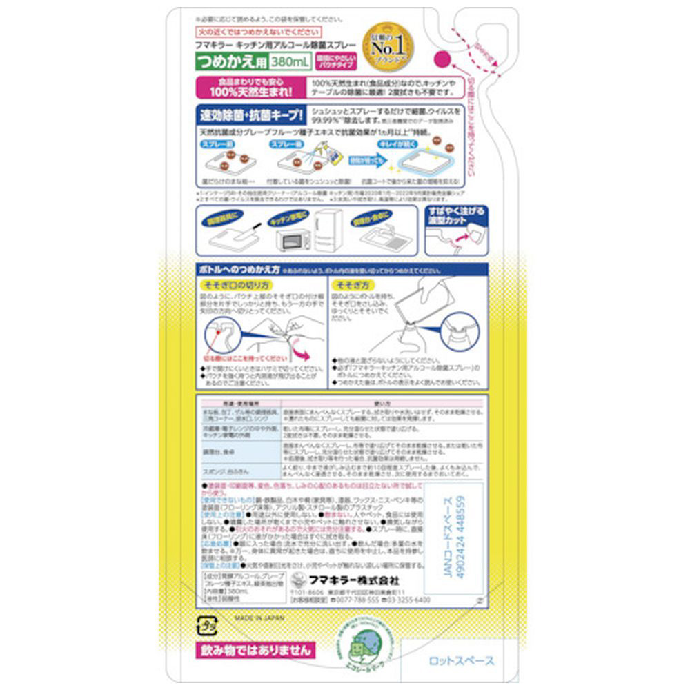 | 商品名 | フマキラー キッチン用アルコール除菌スプレーつめかえ用 380ml |