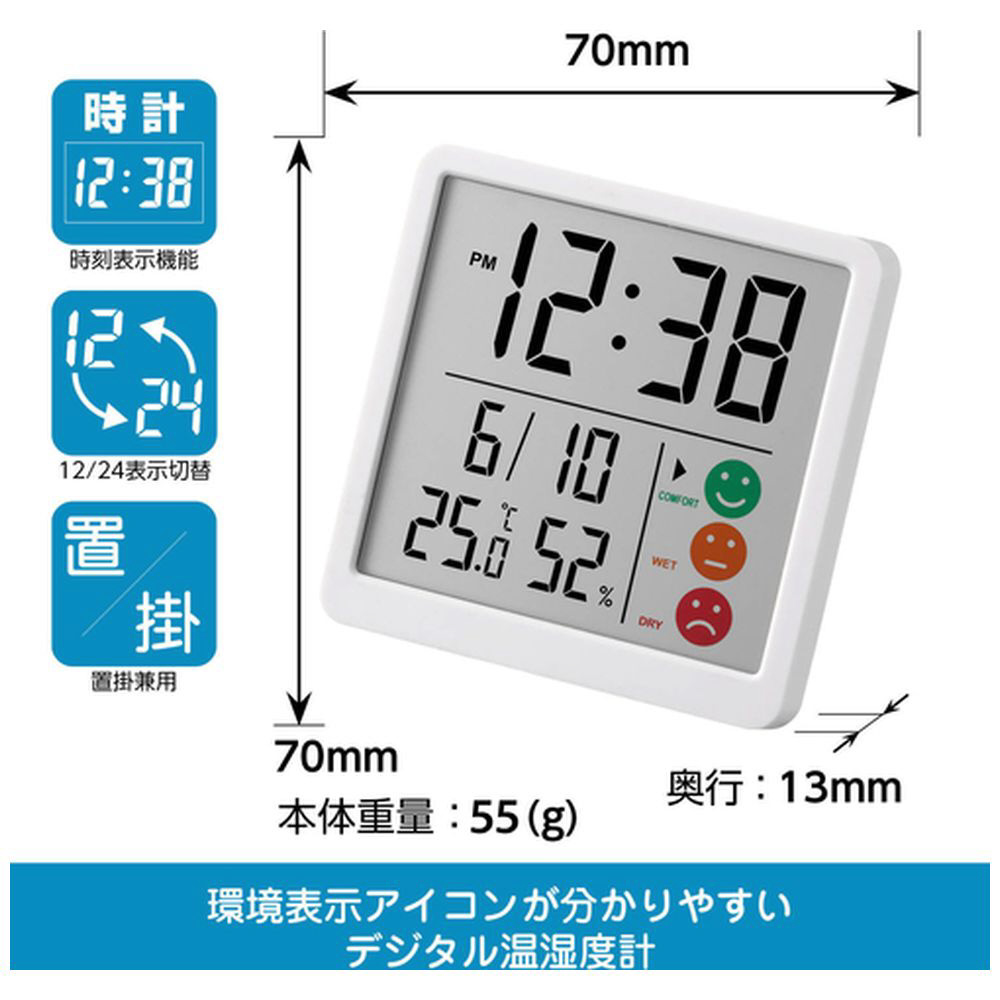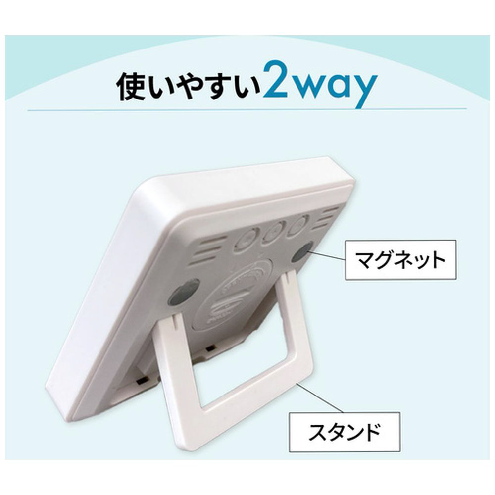 ・環境目安表示、温度表示(-9.9〜+60℃)、湿度表示(20〜95%RH)、時刻表示、マグネット/スタンド付き