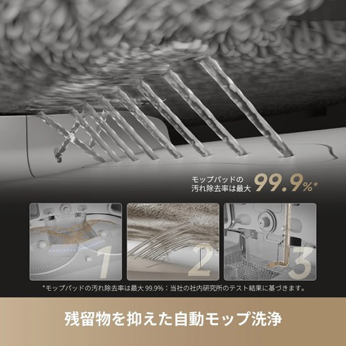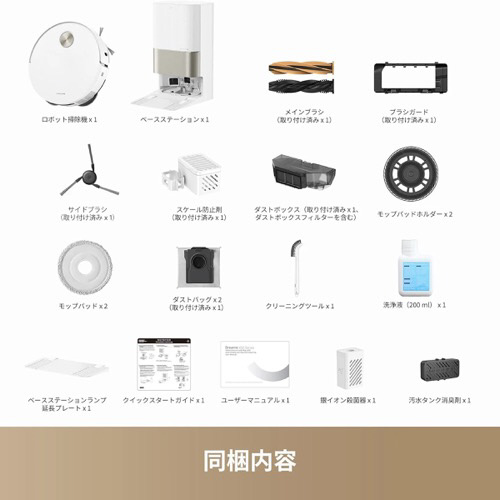 | 付属品 | ロボット掃除機本体x1、全自動充電ステーションx1、サイドブラシx1(装着済)、電源コードx1、ベースステーションプレートx1、洗剤タンク(装着済)、モップパッド x 2(装着済)、モップパッドホルダーx2(装着済)、紙パックx2(装着済x1)、クリーニングツールx1、銀イオン除菌モジュール(装着済)、汚水タンク消臭(装着済)、ウォッシュホ゛ート゛フィルター(装着済)、専用床洗剤x1、クイックガイドx1、ユーザーマニュアルx1 |