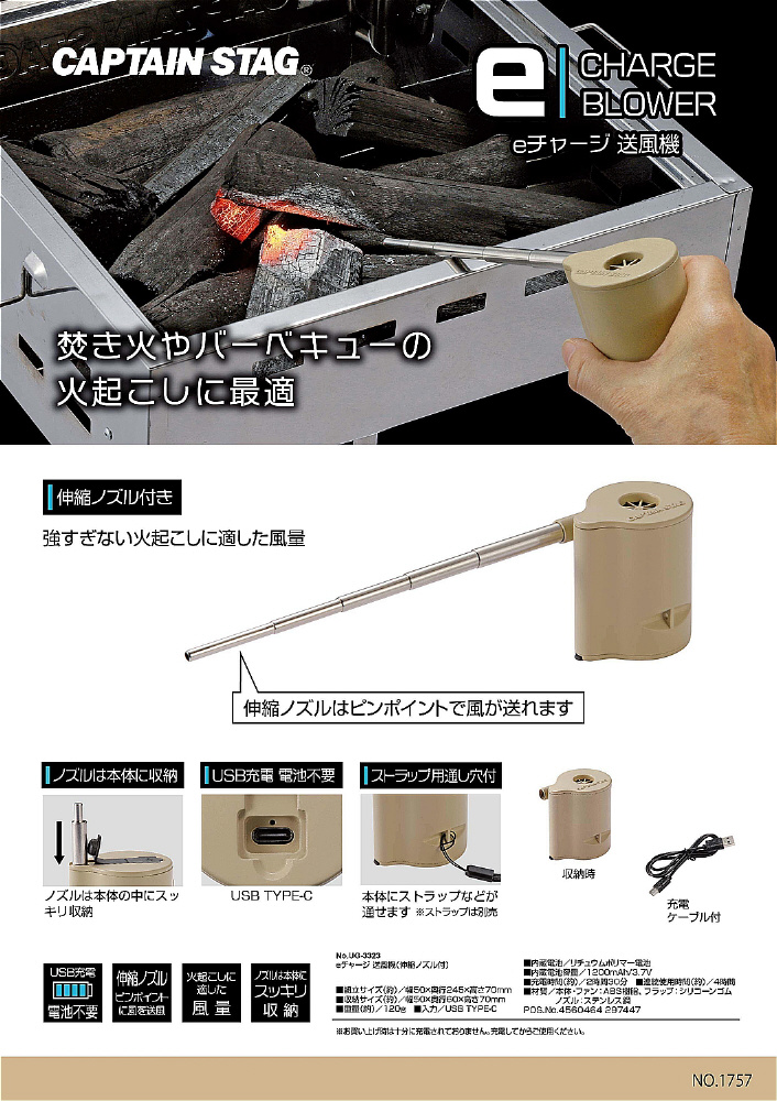 伸縮ノズル付きで強すぎない火起こしに適した風量。