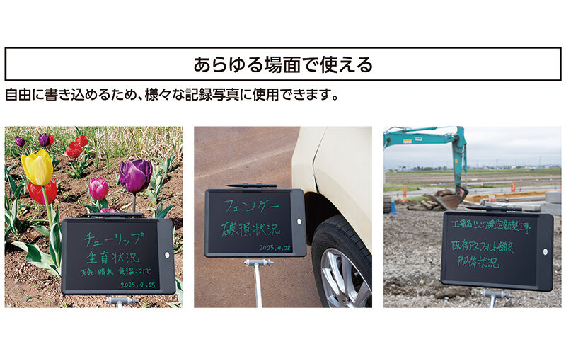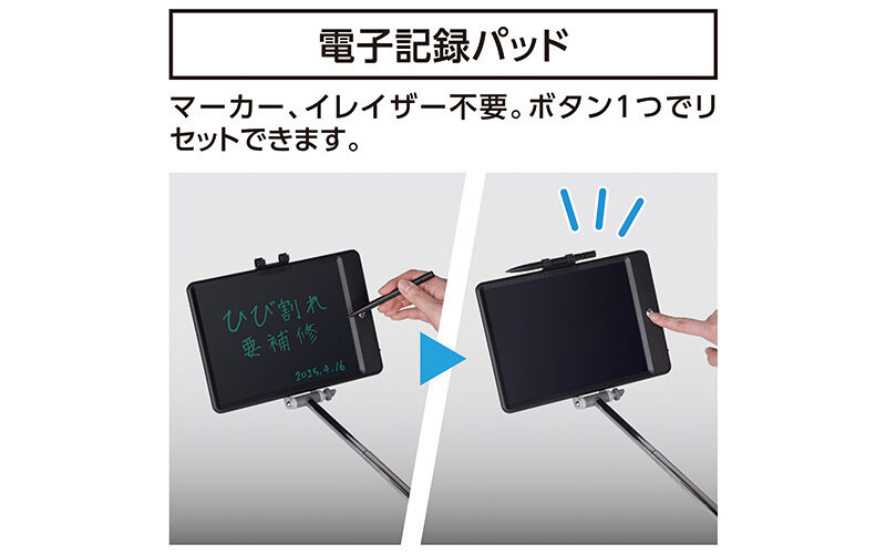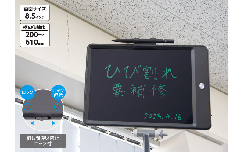 付属のタッチペンで画面に直接書き込みでき、消去ボタンを押すだけで書いた文字を瞬時に消すことができます。書いた内容の誤った消去を防ぐロック機能付です。