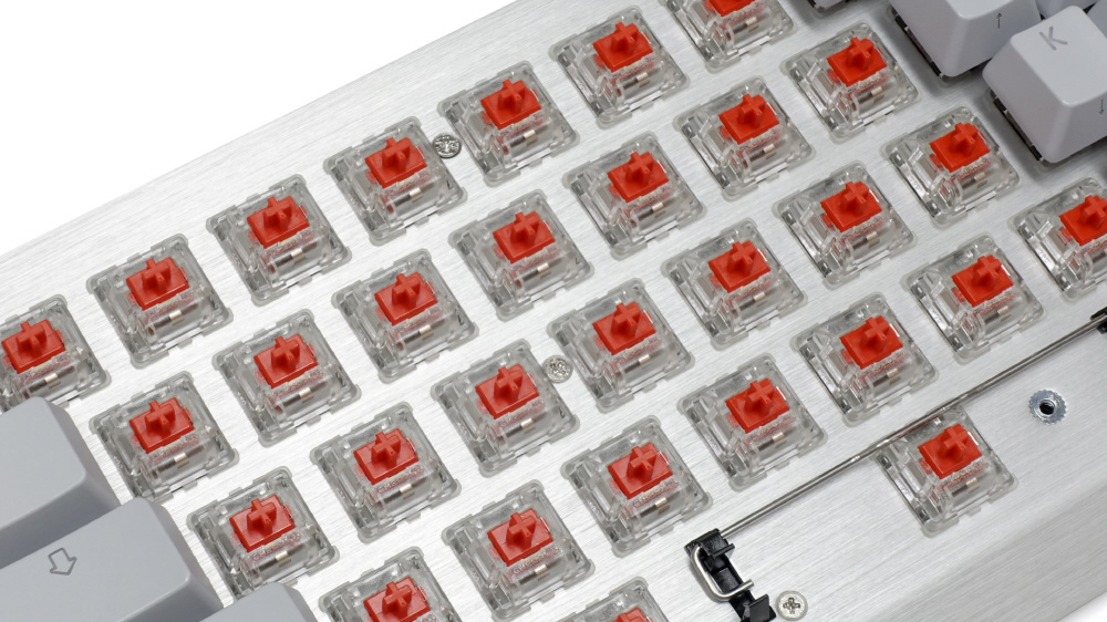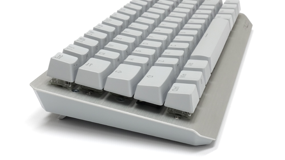 また、本キーボードはフローティングデザインで、ベースプレートにはヘアライン加工したアルミ板を使用した洗練されたデザインのキーボードです。