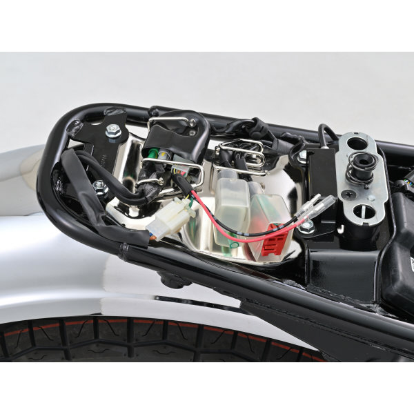 カプラー接線でアクセサリー電源の+と?の配線を取り出せるので、イグニッションキーのON⇔OFFに連動し、キーOFFで電源がカットされます。バッテリーに近い「シート下」取り出しタイプを使えば、D-UNITのアクセサリー電源接続も簡単。
