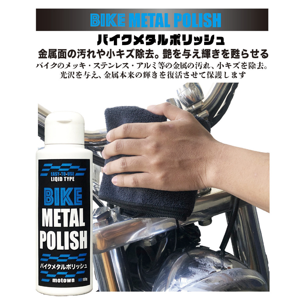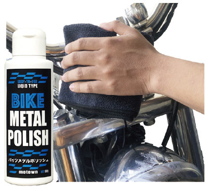 バイクのメッキ・ステンレス・アルミ等の金属の汚れ、小キズを除去。 光沢を与え、金属本来の輝きを復活させて保護します。