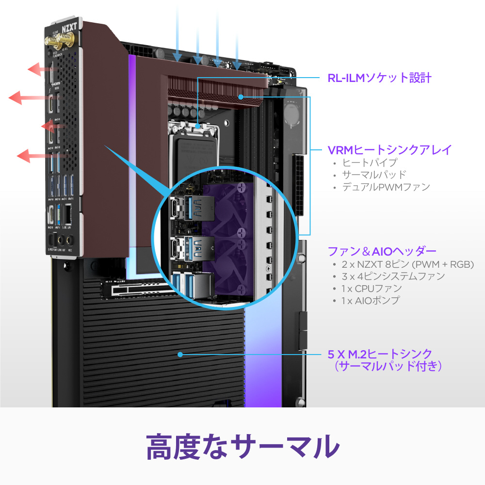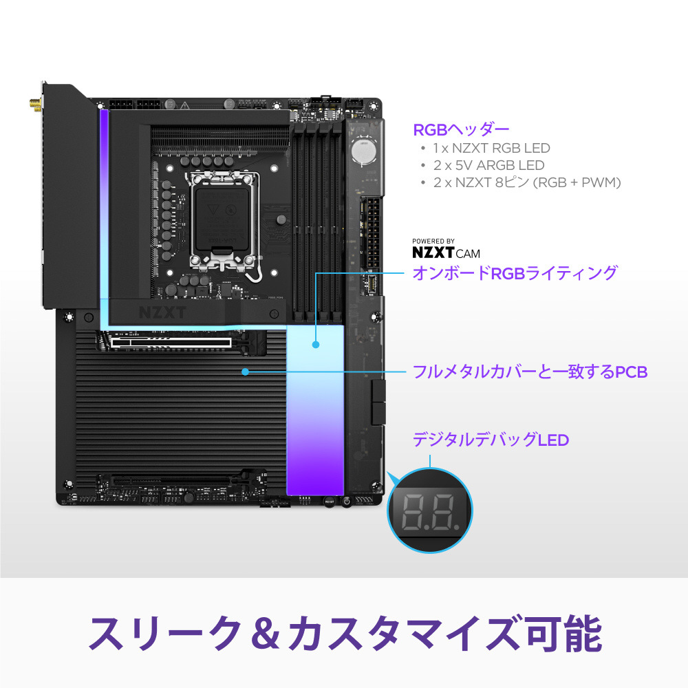 NZXT N9 Z890は、次世代のゲーミング体験を実現するATXマザーボードです。Intel Core Ultra(第2世代)プロセッサーに対応し、PCIe 5.0、Wi-Fi 7、Thunderbolt 4など最先端の接続性を備えています。