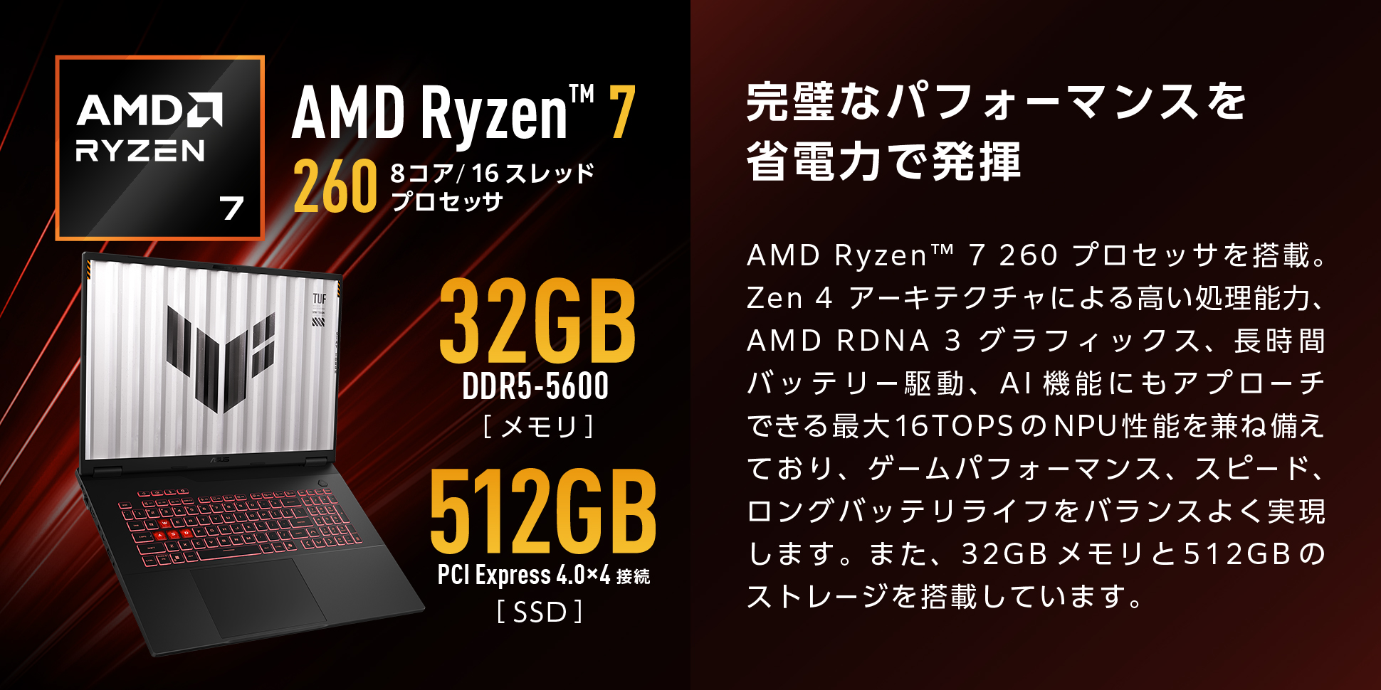 AMD Ryzen 7 260 プロセッサを搭載。Zen 4 アーキテクチャによる高い処理能力、AMD RDNA 3 グラフィックス、長時間バッテリー駆動、AI機能にもアプローチできる最大16TOPSのNPU性能を兼ね備えており、ゲームパフォーマンス、スピード、ロングバッテリライフをバランスよく実現します。また、32GBメモリと512GBのストレージを搭載しています。