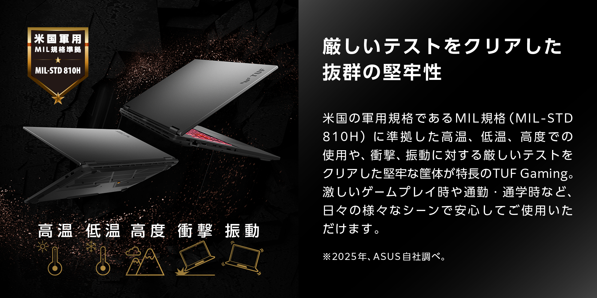 米国の軍用規格であるMIL規格(MIL-STD 810H)に準拠した高温、低温、高度での使用や、衝撃、振動に対する厳しいテストをクリアした堅牢な筐体が特長のTUF Gaming。激しいゲームプレイ時や通勤・通学時など、日々の様々なシーンで安心してご使用いただけます。