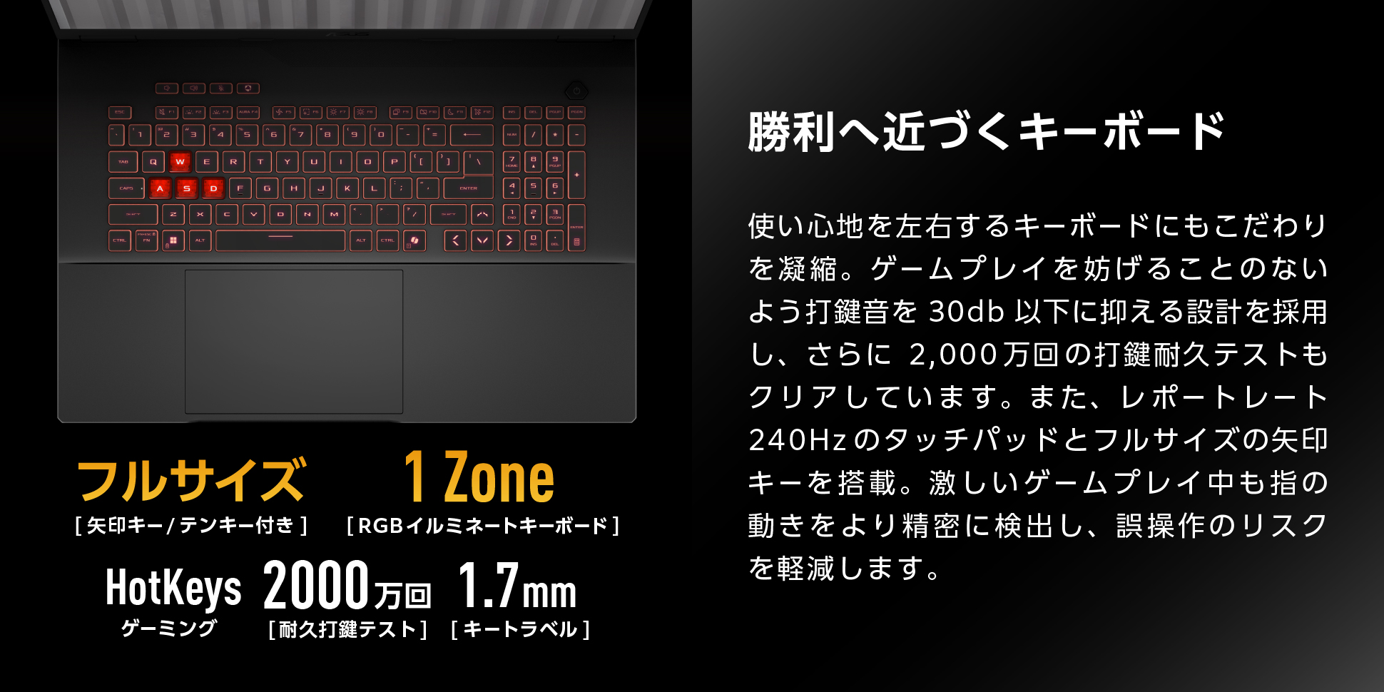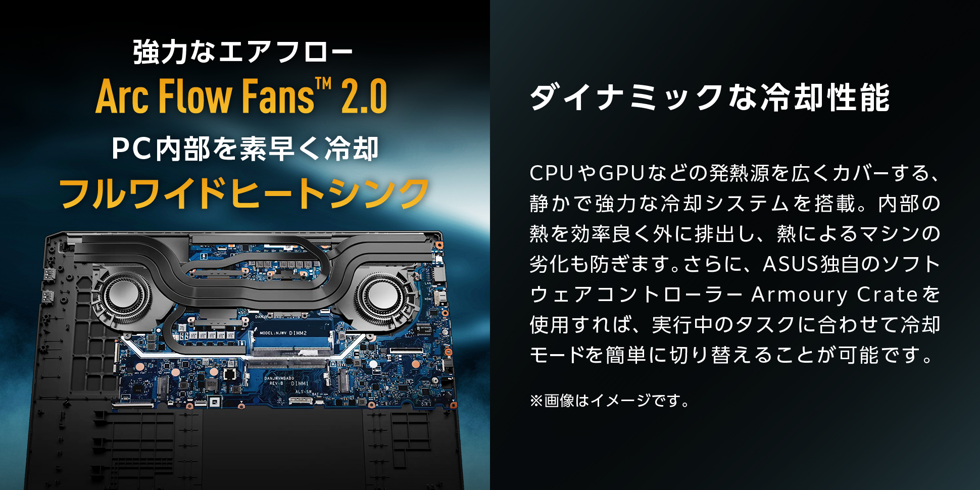 CPUやGPUなどの発熱源を広くカバーする、静かで強力な冷却システムを搭載。内部の熱を効率良く外に排出し、熱によるマシンの劣化も防ぎます。さらにASUS独自のソフトウェアコントローラーArmoury Crateを使用すれば、実行中のタスクに合わせて冷却モードを簡単に切り替えることが可能です。