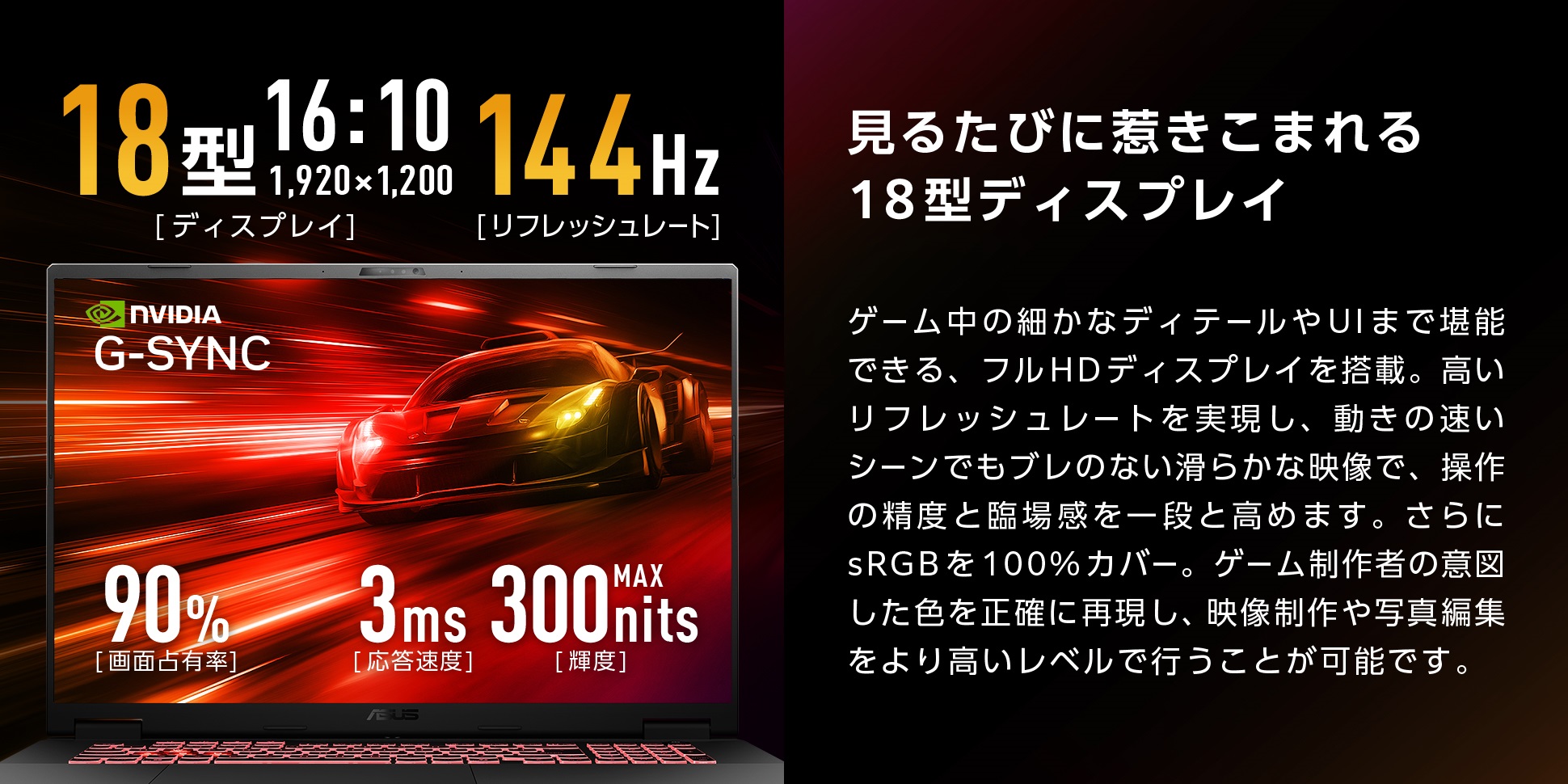 ゲーム中の細かなディテールやUIまで堪能できる、FHDディスプレイを搭載。高いリフレッシュレートを実現し、動きの速いシーンでもブレのない滑らかな映像で、操作の精度と臨場感を一段と高めます。さらにsRGBを100%カバー。ゲーム制作者の意図した色を正確に再現し、映像制作や写真編集をより高いレベルで行うことが可能です。