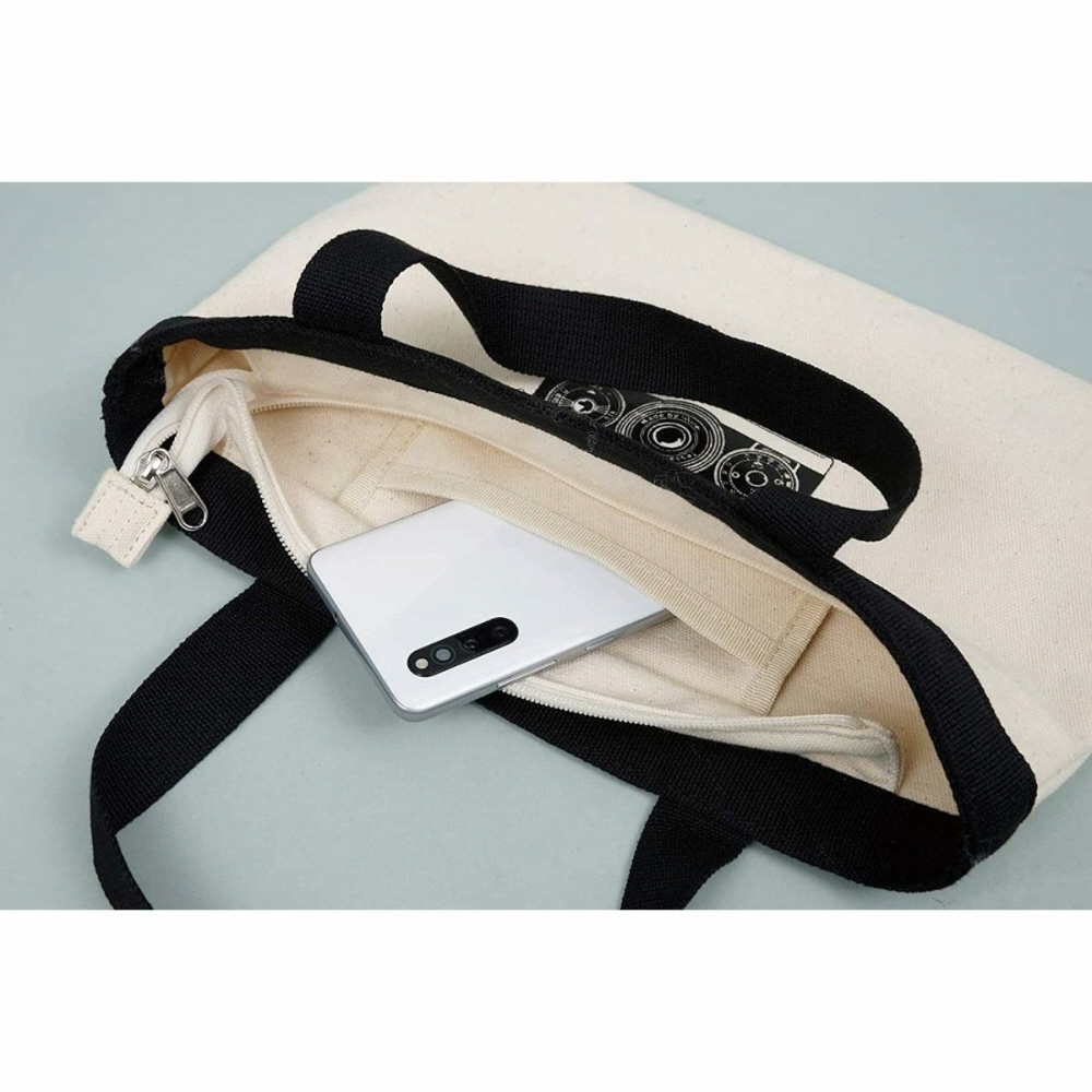 丈夫な帆布素材を使用したトートバッグ。ちょっとしたお出かけなど普段使いにぴったりのサイズ感。貴重品の保護に役立つ裏地やファスナー、スマートフォンや小物を収納できる便利な内ポケットも付いていて機能的です。