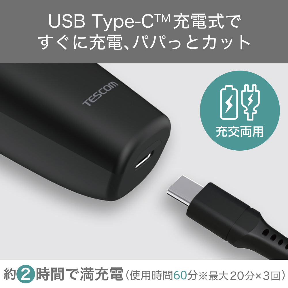 コードレスでどこでも快適カット。細かな調節が簡単にできる、使いやすいベーシックなヘアカッターです。防水設計で濡れ髪のカットも可能。USB Type-C(TM)充電式で、切りたいその日にすぐに充電、パパっとカット。場所を選ばずホームカットを楽しめます。