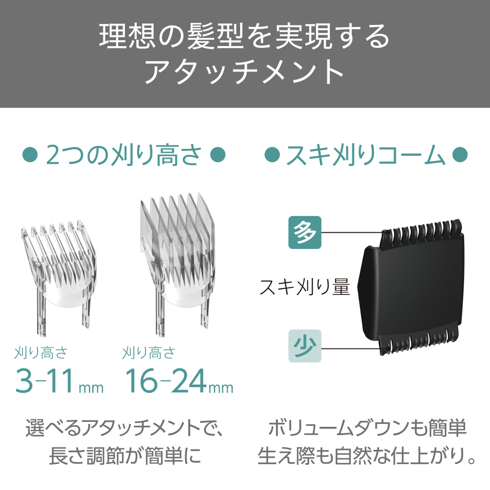 | アタッチメントの種類 | コーム2種(刈り高さ3mm-11mm/16mm-24mm) |