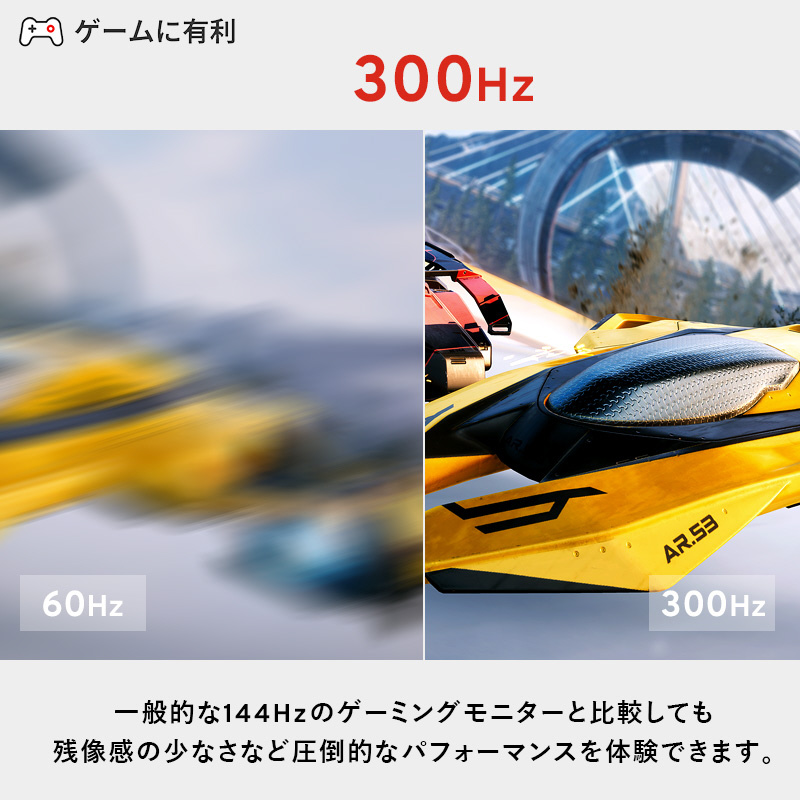 1秒間に最大300フレームを描写することで、一般的なゲーミングモニターである144Hzのモニターと比べると映像がなめらかで視認性が良く、映像のブレが抑制されます。