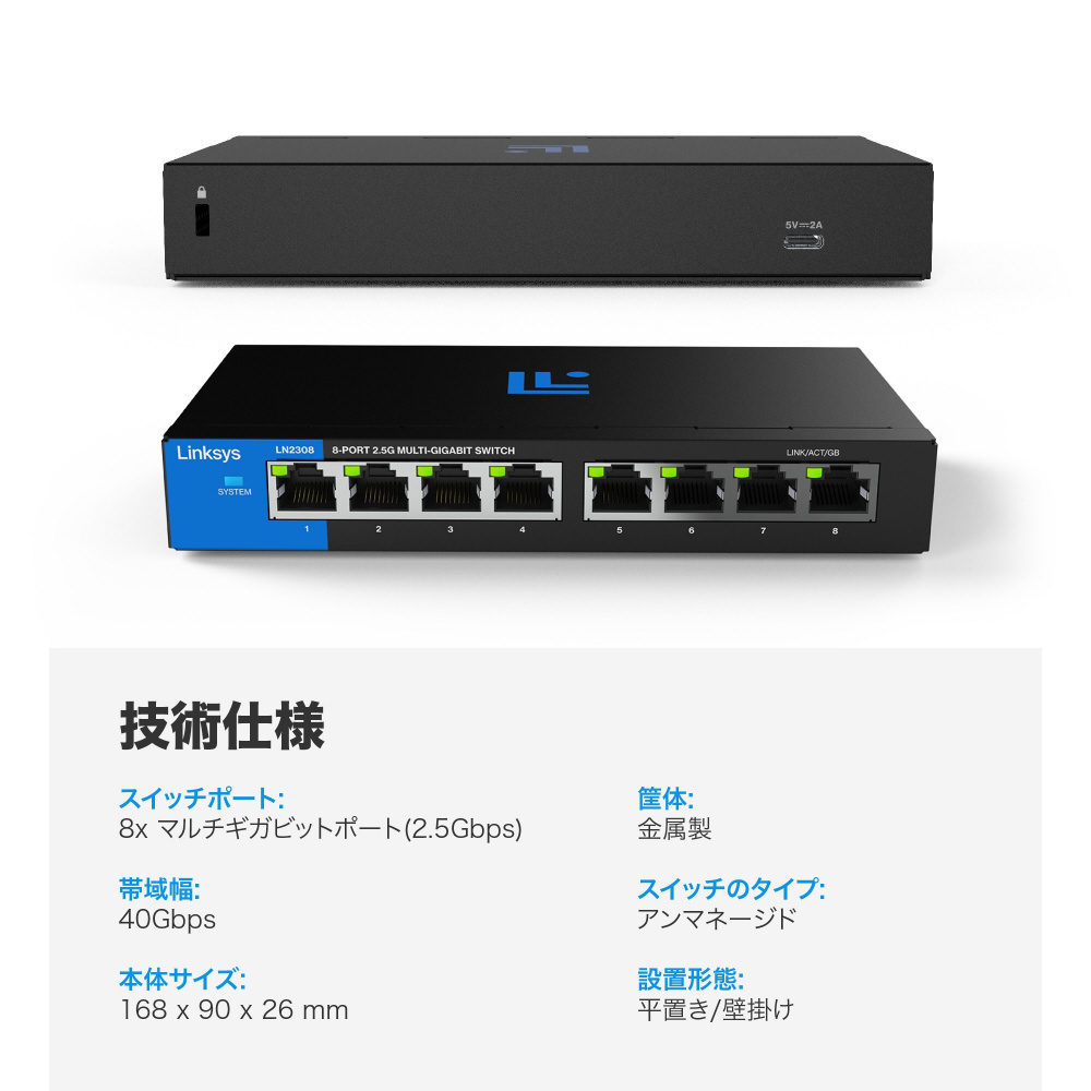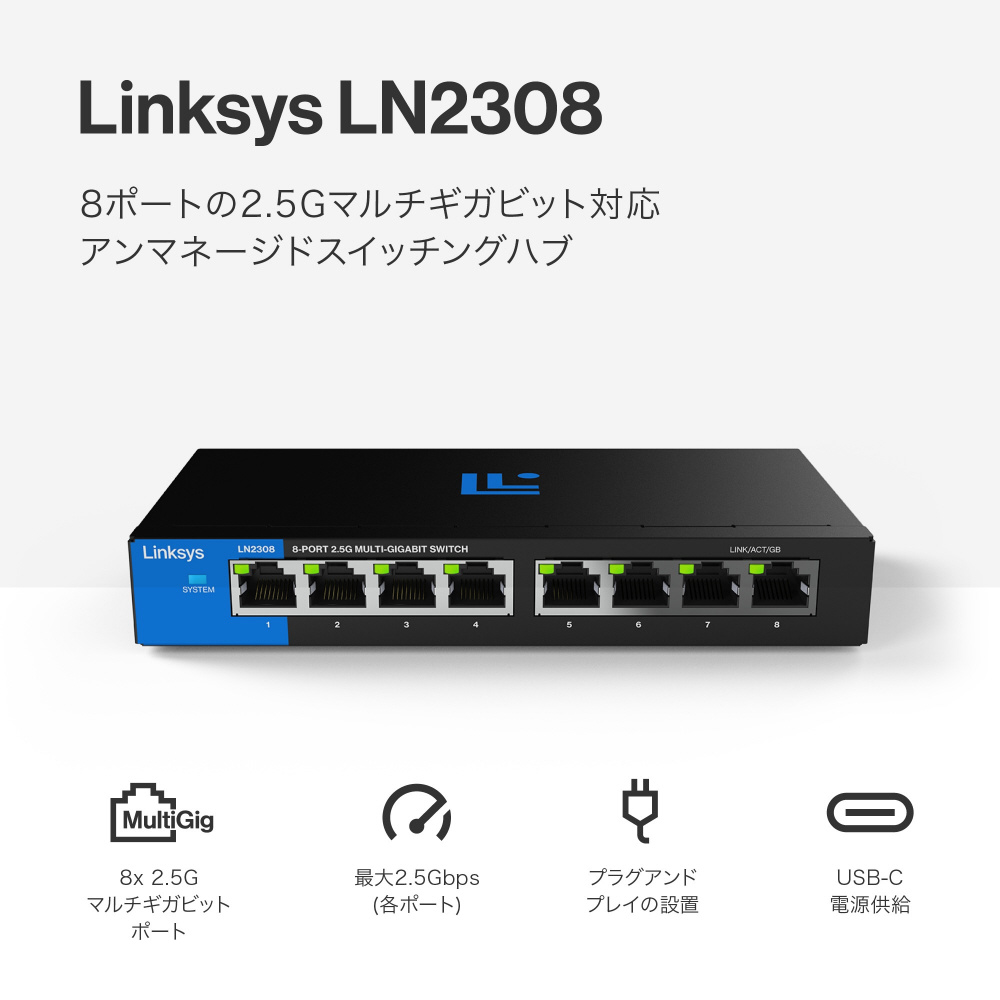 スイッチングハブ [8ポート /2.5Giga対応 /ACアダプタ] LINKSYS 8-PORT 2.5G MULTI-GIG UNMANAGED SWITCH(USB-Cメス給電対応) LN2308-AH